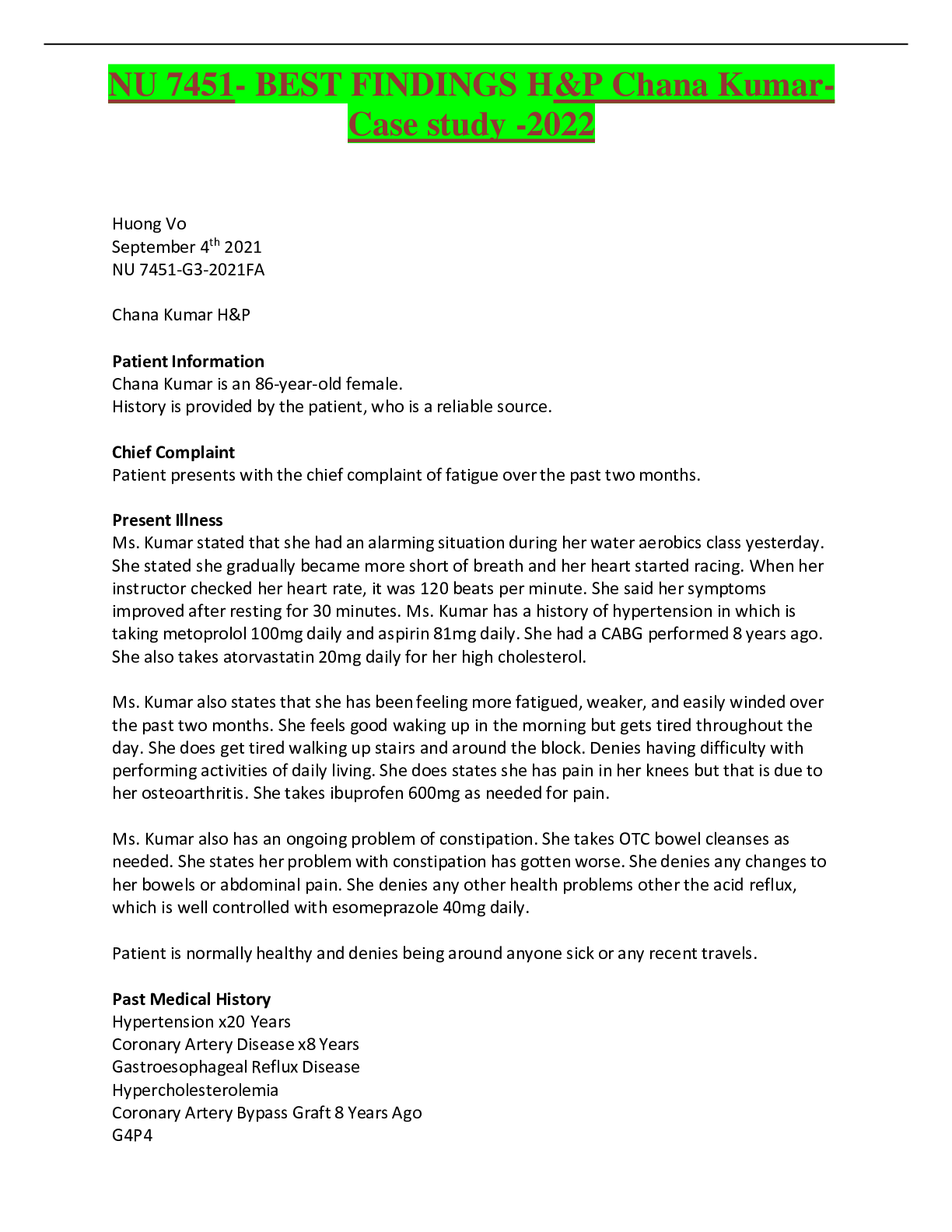 Health Care > ANSWERS AND COMMENTARIES > NU 7451- BEST FINDINGS H&P Chana Kumar-Case study -2022