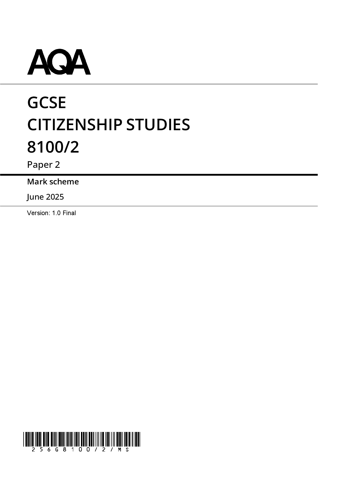 Citizenship Studies > GCSE MARK SCHEME > 2025 AQA GCSE CITIZENSHIP STUDIES Paper 2 MARK SCHEME 8100/2