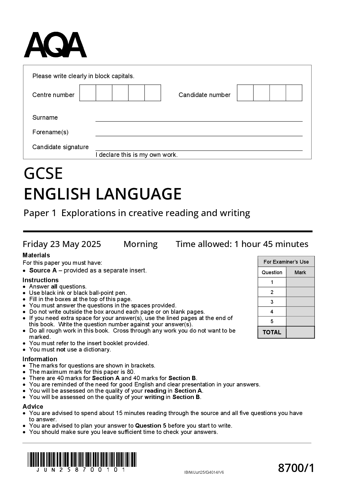 English Language > GCSE QUESTION PAPER > 2025 AQA GCSE ENGLISH LANGUAGE PAPER 1 QUESTION PAPER 8700/1