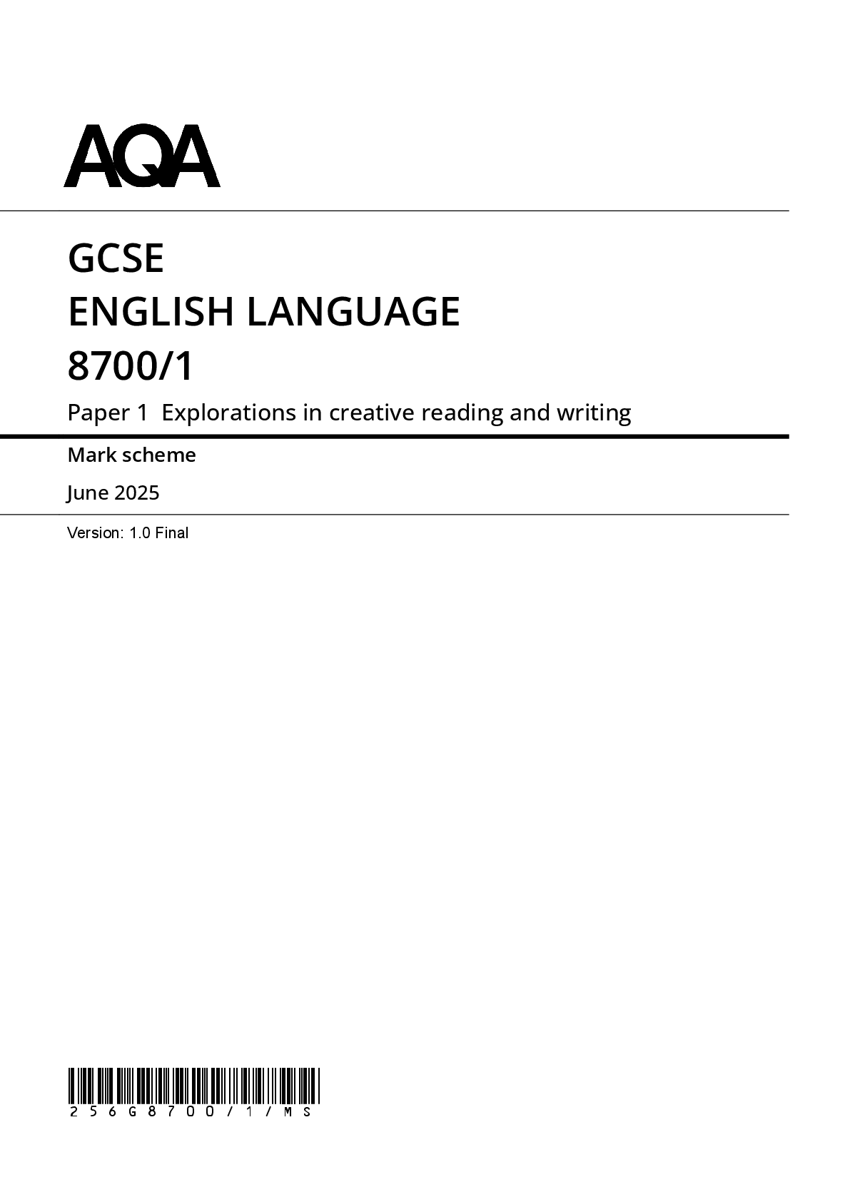 English Language > GCSE QUESTION PAPER > 2025 AQA GCSE ENGLISH LANGUAGE PAPER 1 MARK SCHEME 8700/1