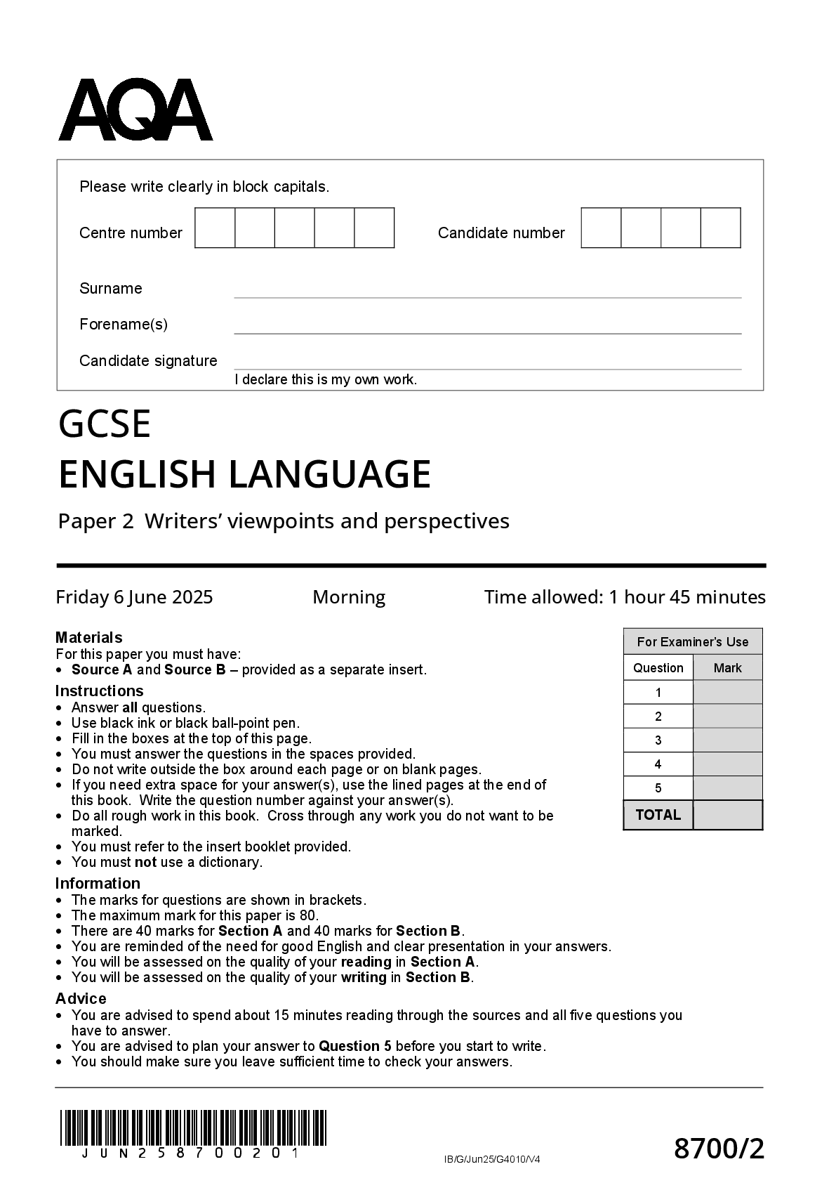 English Language > GCSE QUESTION PAPER > 2025 AQA GCSE ENGLISH LANGUAGE PAPER 2 QUESTION PAPER 8700/2