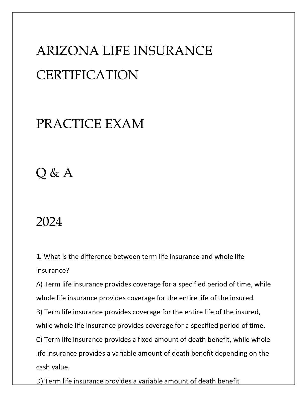 *NURSING > ESSAY > ARIZONA LIFE INSURANCE CERTIFICATION PRACTICE EXAM Q & A 2024