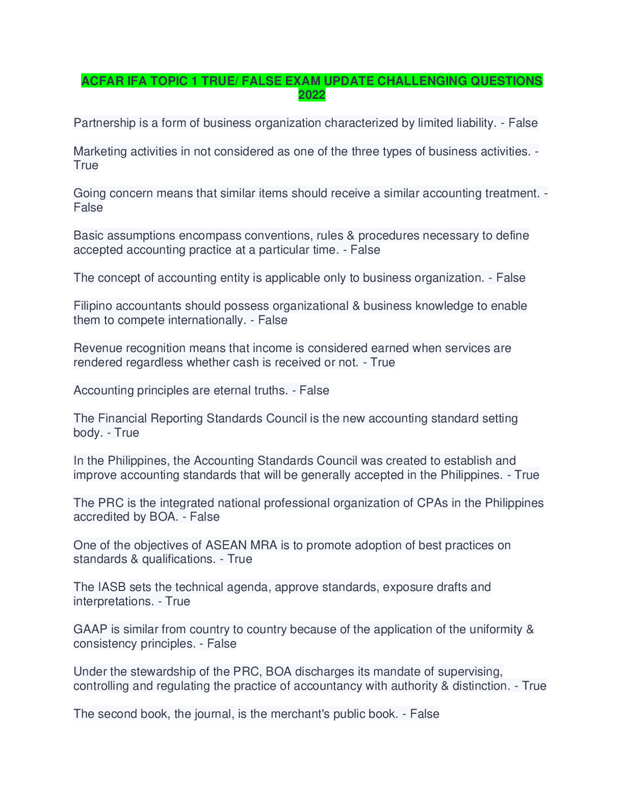 Education > ESSAY > ACFAR IFA Topic 3 (t or f) exam solution update 2022