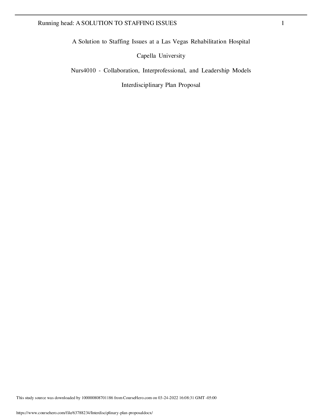 > Essay - A Solution to Staffing Issues at a Las Vegas Rehabilitation Hospital Capella University Nurs4010 - Collaboration, Interprofessional, and Leadership Models Interdisciplinary Plan Proposal.