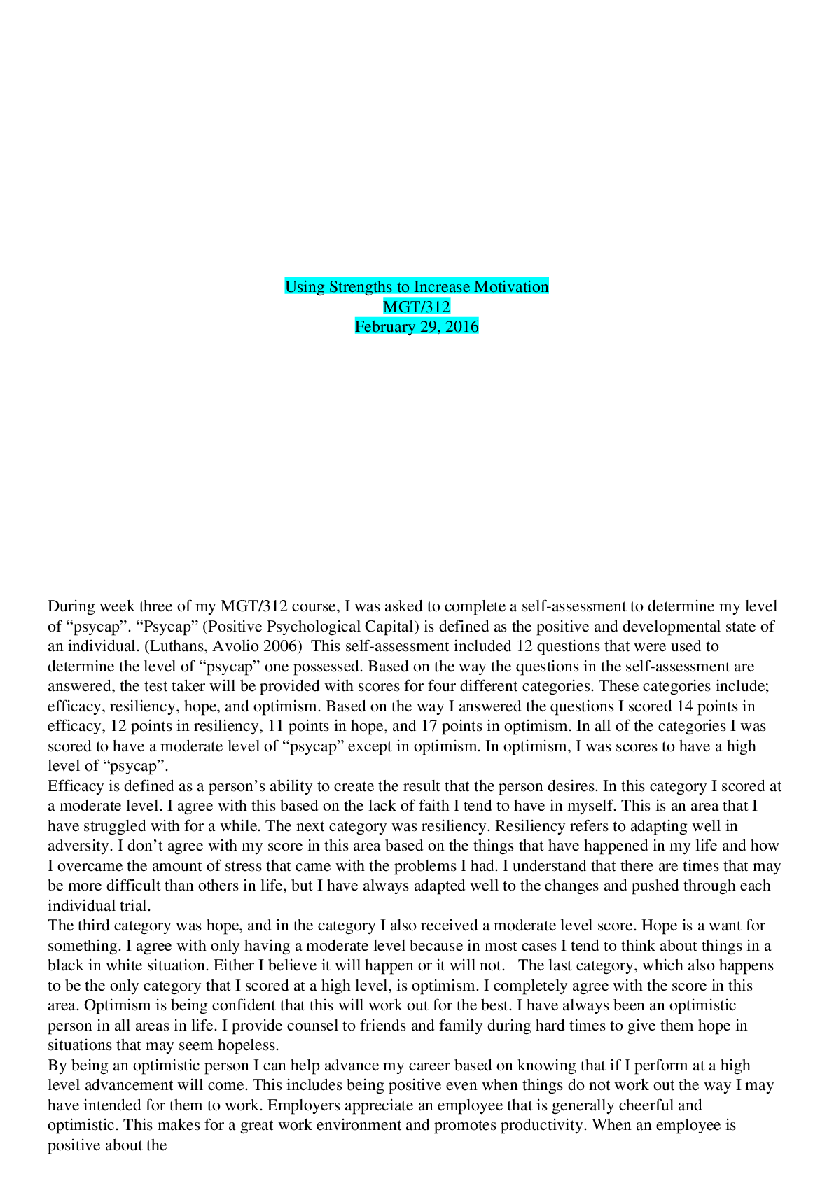 Management > ESSAY > MGT 312 WEEK 3 Using Strengths to Increase Motivation
