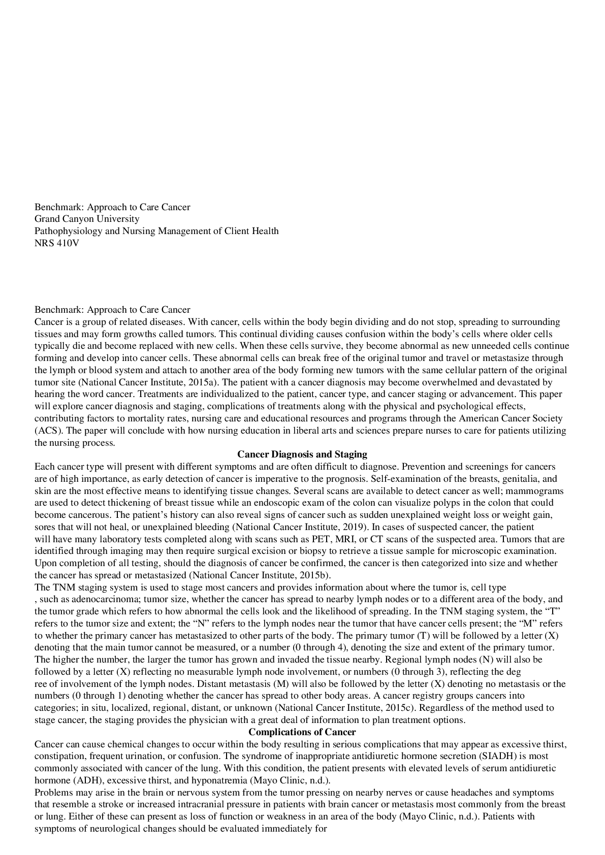 *NURSING > ESSAY > NRS 410V Pathophysiology and Nursing Management of Client Health,Benchmark: Approach to Care Cancer