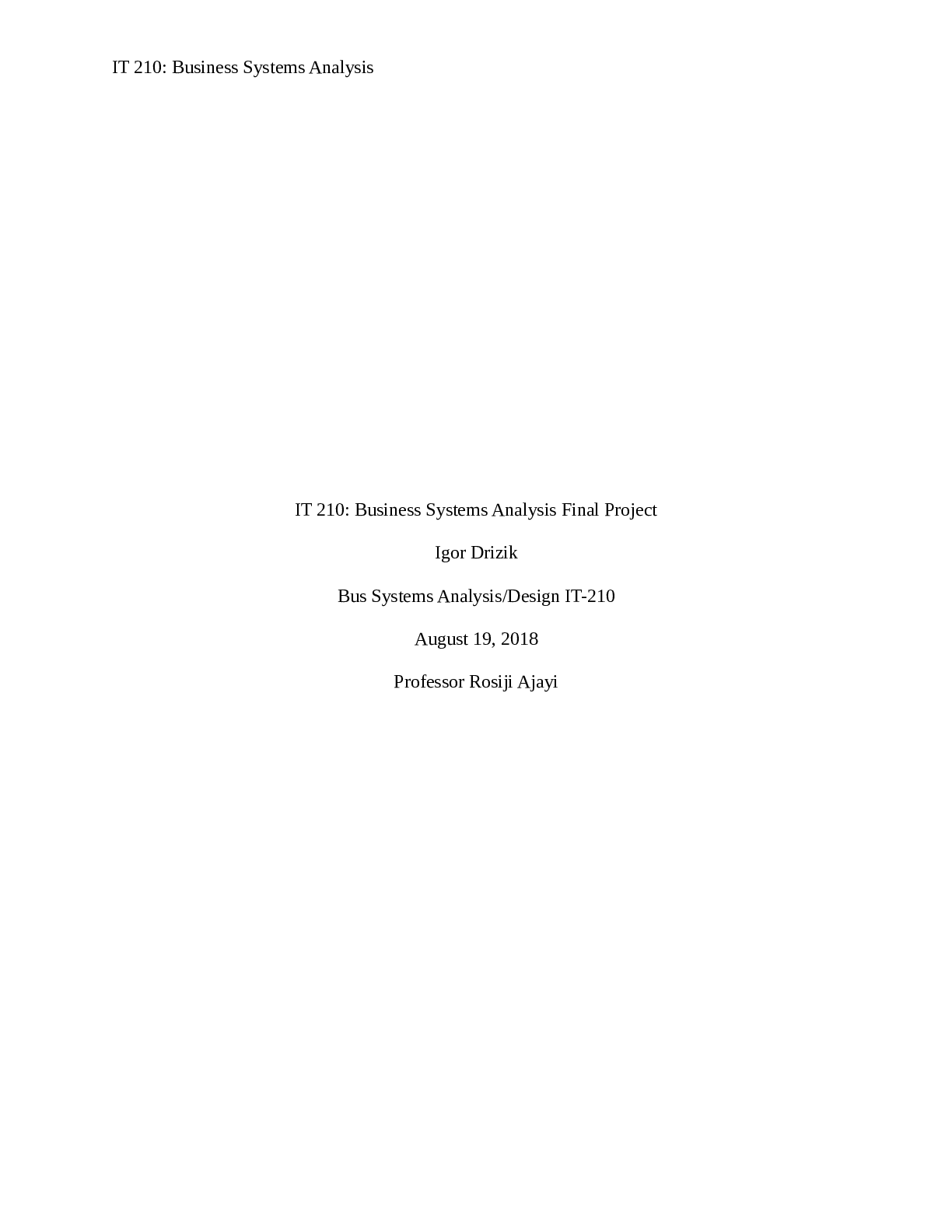 Business > ESSAY > Summary IT 210: Business Systems Analysis Final Project Bus Systems Analysis/Design IT-210 Southern New Hampshire University Contents Introduction 5 Problem Statement 5 Two Technologies 5 Business Requirements 5 Objectives 5 Project Description 5 Key Technol