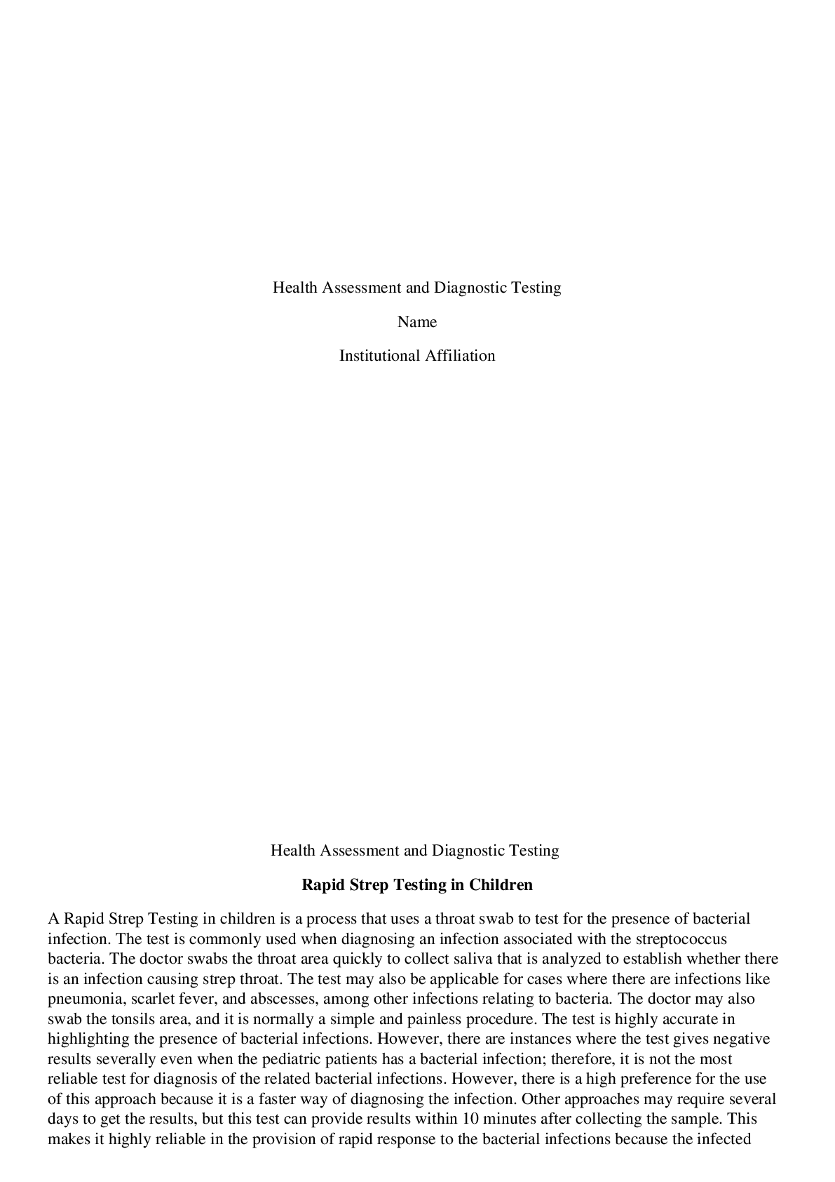 *NURSING > ESSAY > Health Assessment and Diagnostic Testing