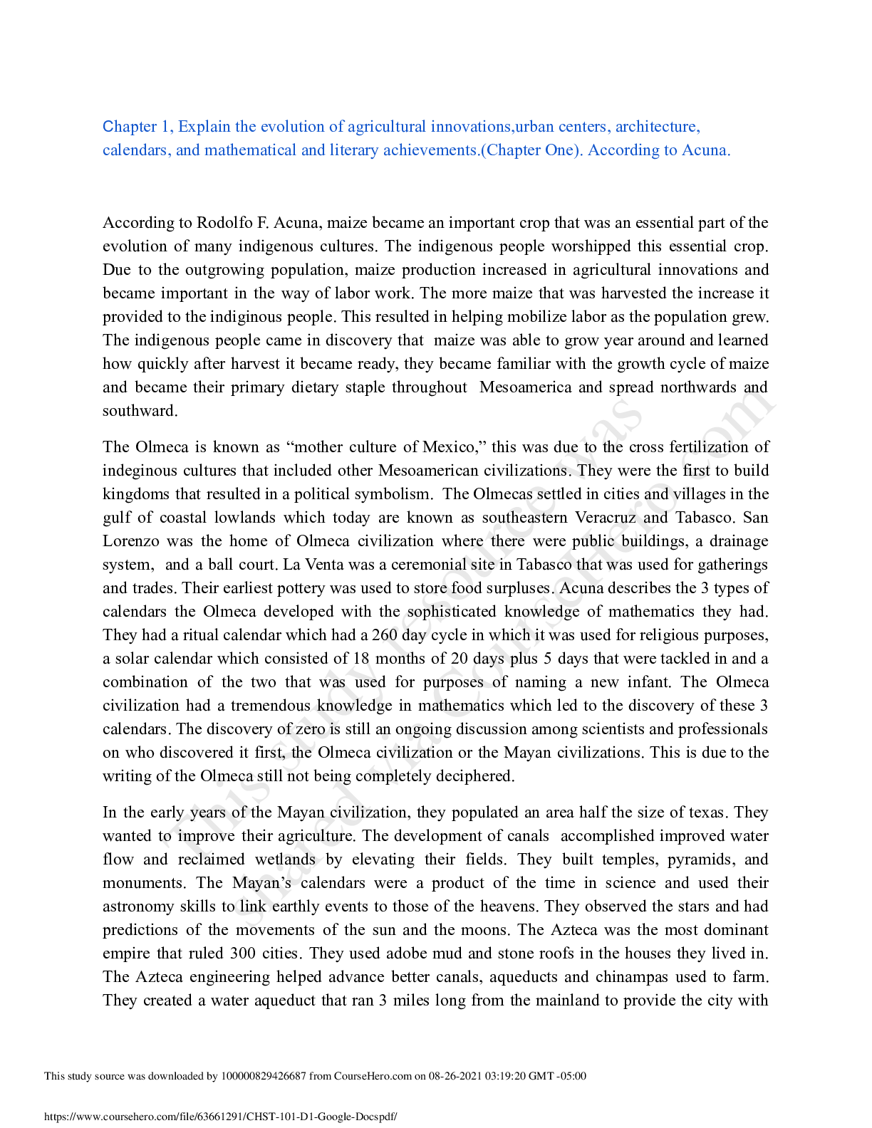> CHST 101CHST 101_ D1 - Google Docs Chapter 1, Explain the evolution of agricultural innovations,urban centers, architecture, calendars, and mathematical and literary achievements.(Chapter One). According to Acuna
