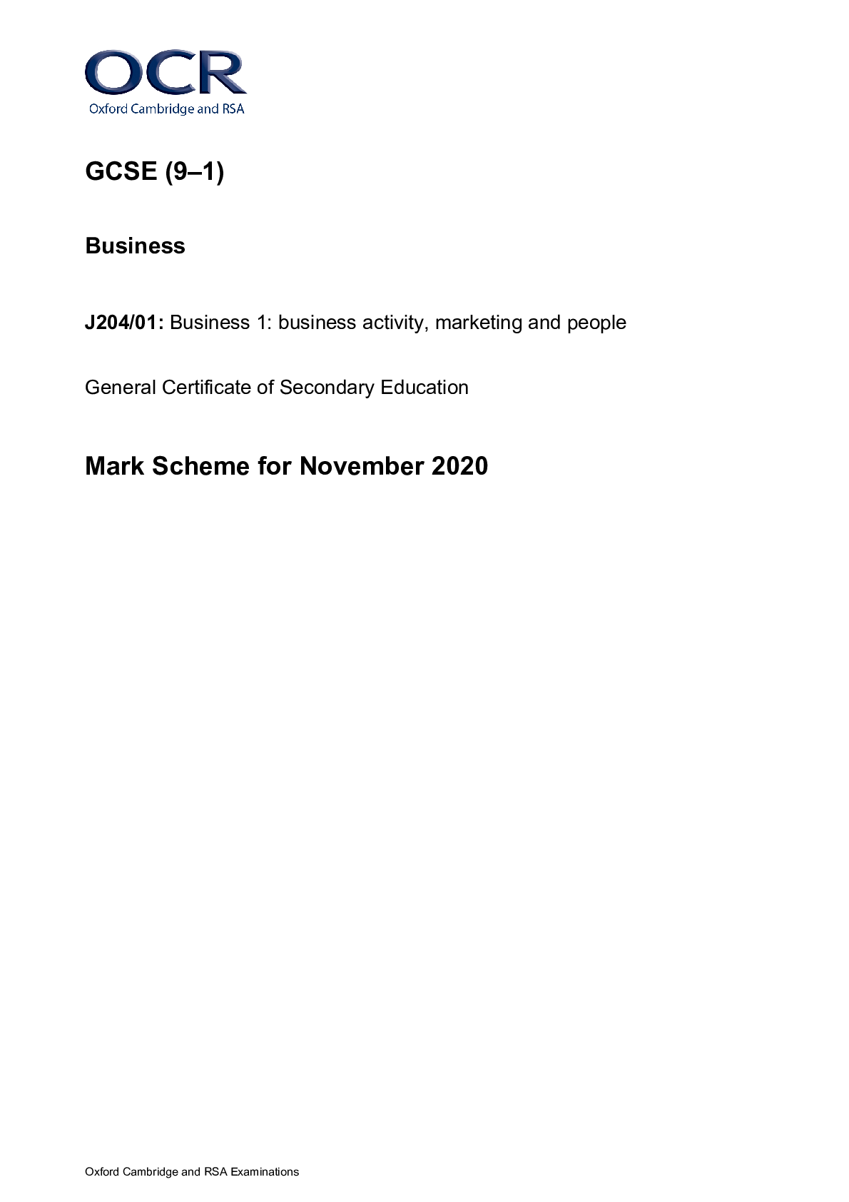 Business > A/As Level Mark Scheme > > GCSE (9–1) Business J204/01: Business 1: business activity, marketing and people General Certificate of Secondary Education Mark Scheme for November 2020