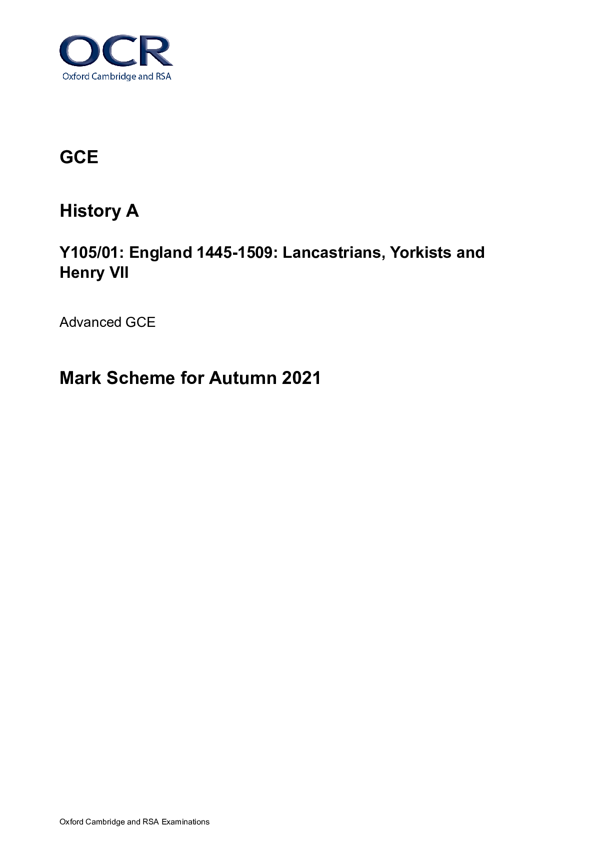 History > A/As Level Mark Scheme > > GCE History A Y105/01: England 1445-1509: Lancastrians, Yorkists and Henry VII Advanced GCE Mark Scheme for Autumn 2021
