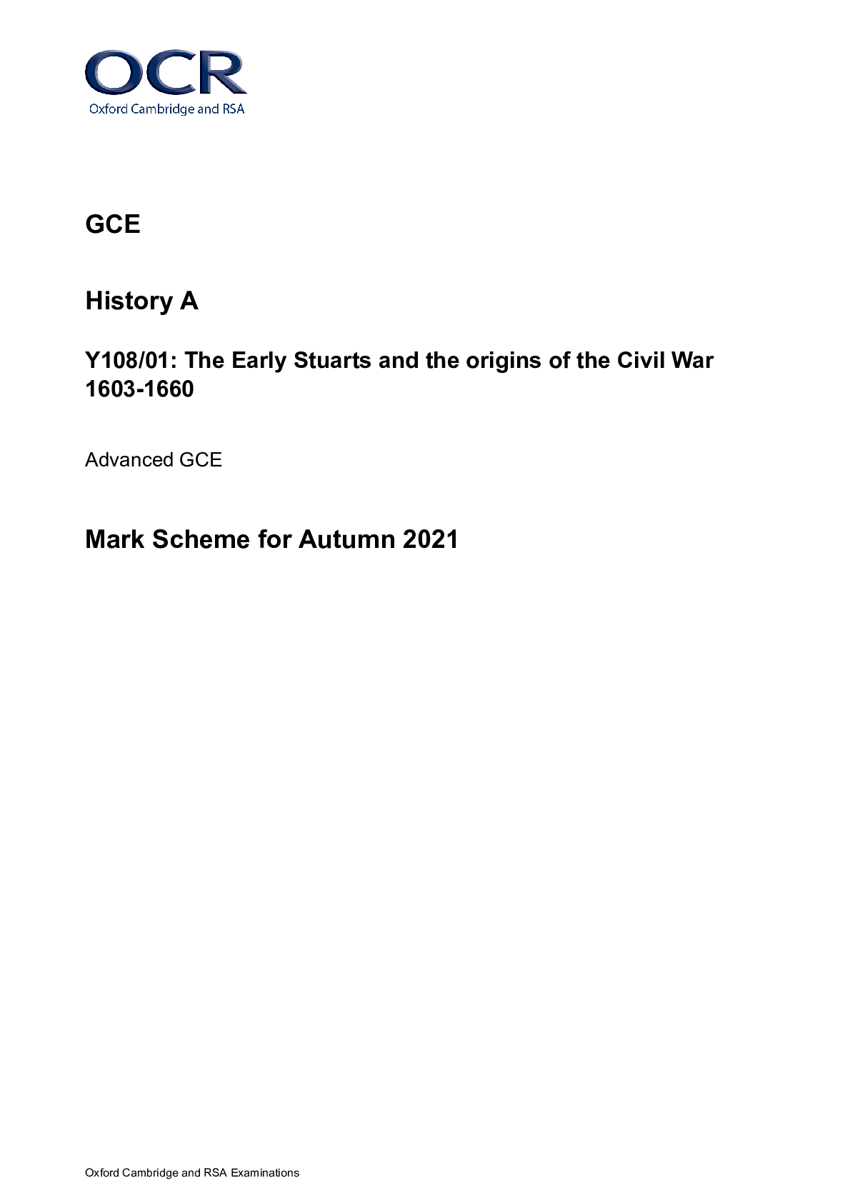 History > A/As Level Mark Scheme > > GCE History A Y108/01: The Early Stuarts and the origins of the Civil War 1603-1660 Advanced GCE Mark Scheme for Autumn 2021