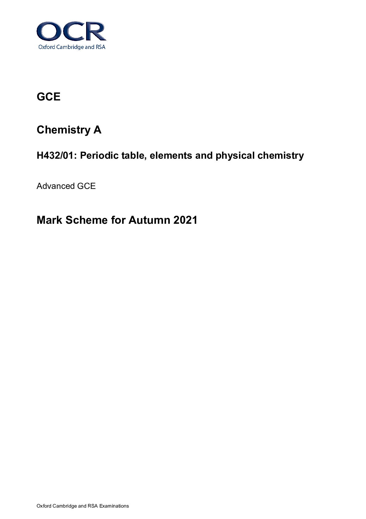ChemistryA/As Level Mark Scheme  > > GCE Chemistry A H432/01: Periodic table, elements and physical chemistry Advanced GCE Mark Scheme for Autumn 2021