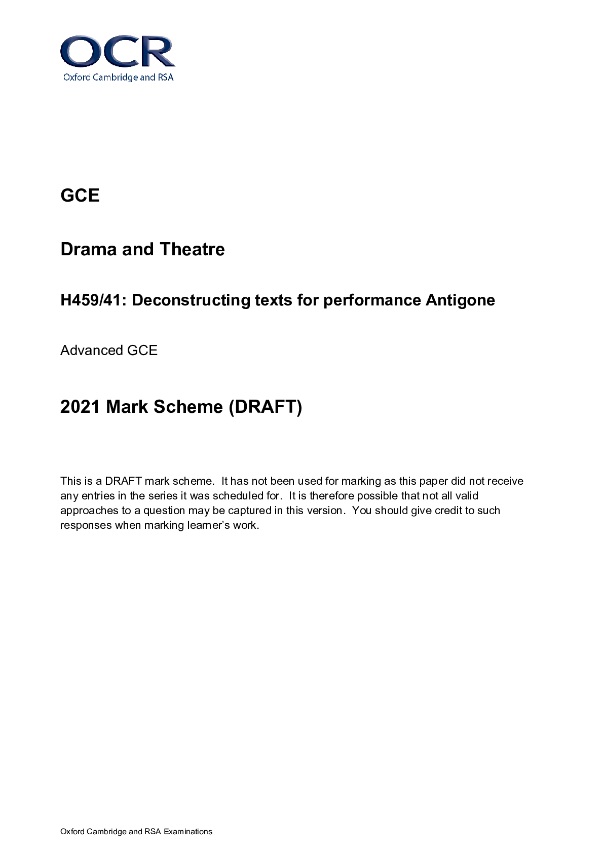 Drama and Theatre > A/As Level Mark Scheme > Oxford Cambridge and RSA Examinations GCE Drama and Theatre H459/41: Deconstructing texts for performance Antigone Advanced GCE 2021 Mark Scheme (DRAFT)