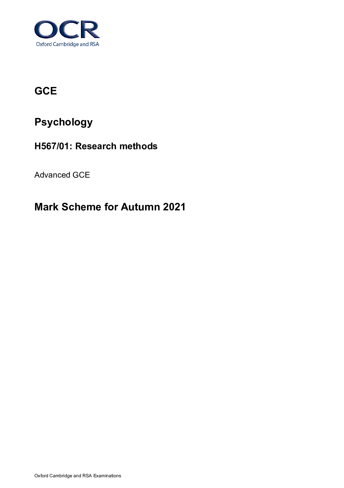 Psychology > A/As Level Mark Scheme > OCR GCE Psychology H567/01: Research methods Advanced GCE Mark Scheme for Autumn 2021