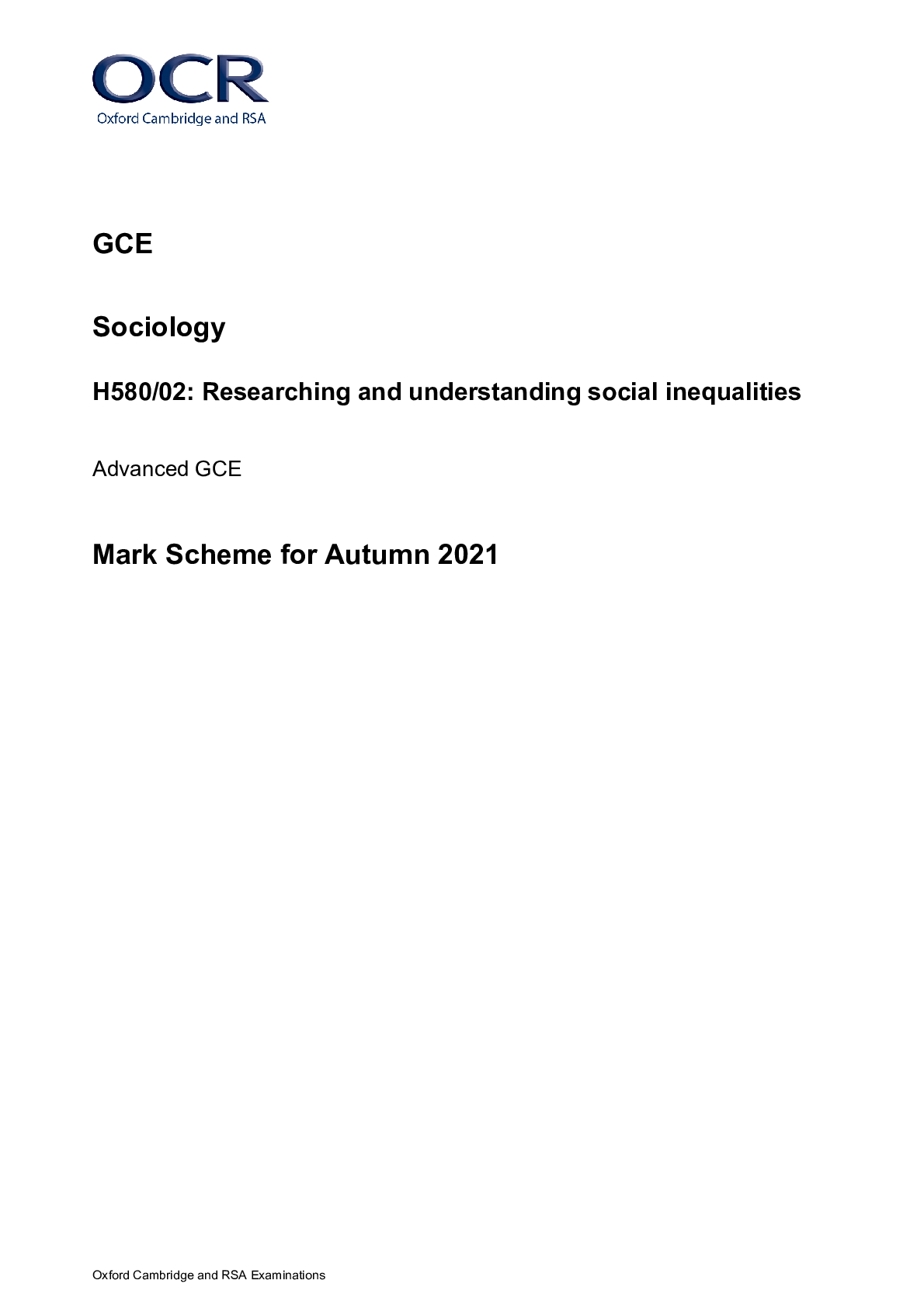Sociology > A/As Level Mark Scheme > > GCE Sociology H580/02: Researching and understanding social inequalities Advanced GCE Mark Scheme for Autumn 2021