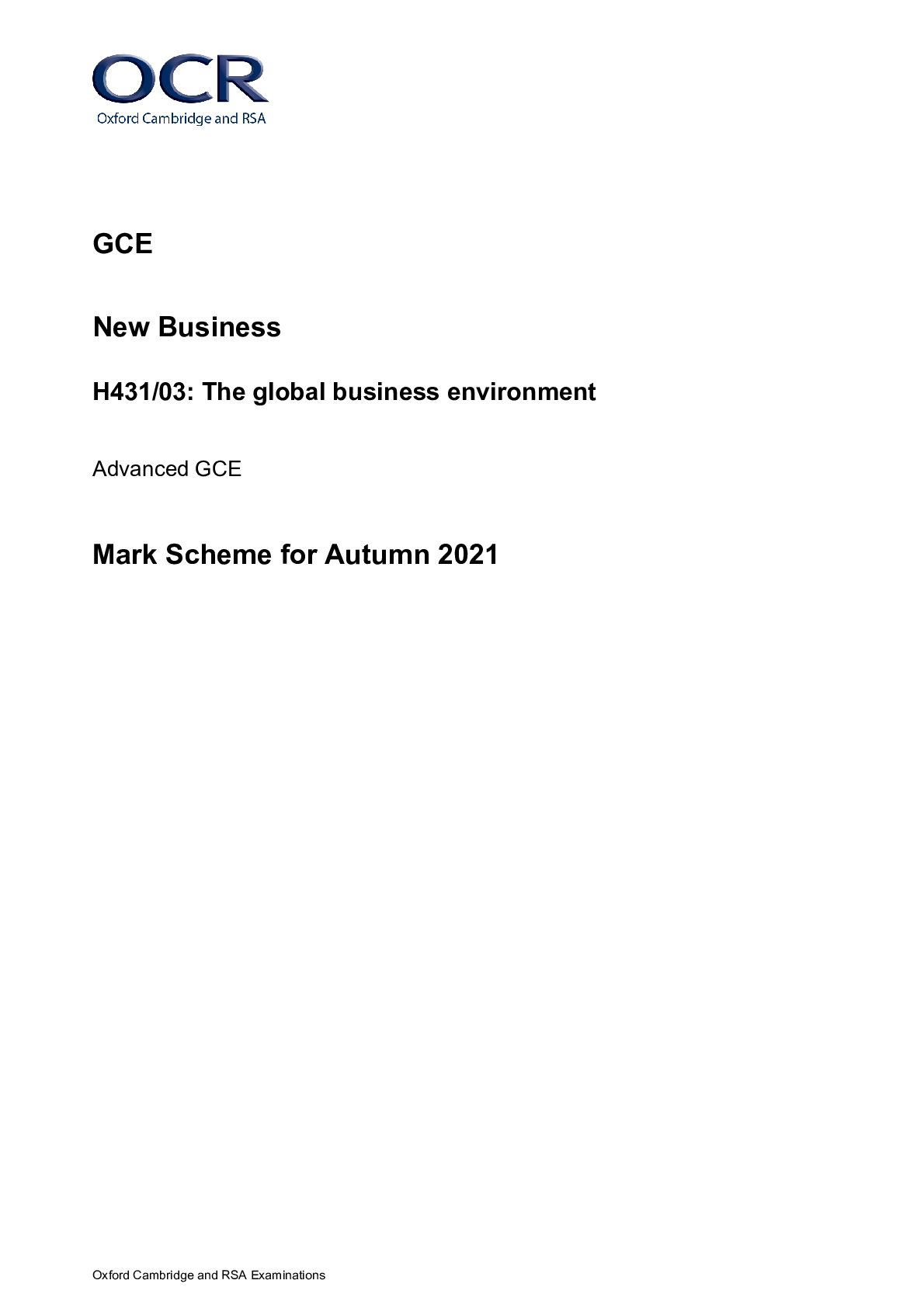 Business > A/As Level Mark Scheme > > A Level H431/03: The global business environment Advanced GCE Mark Scheme for Autumn 2021