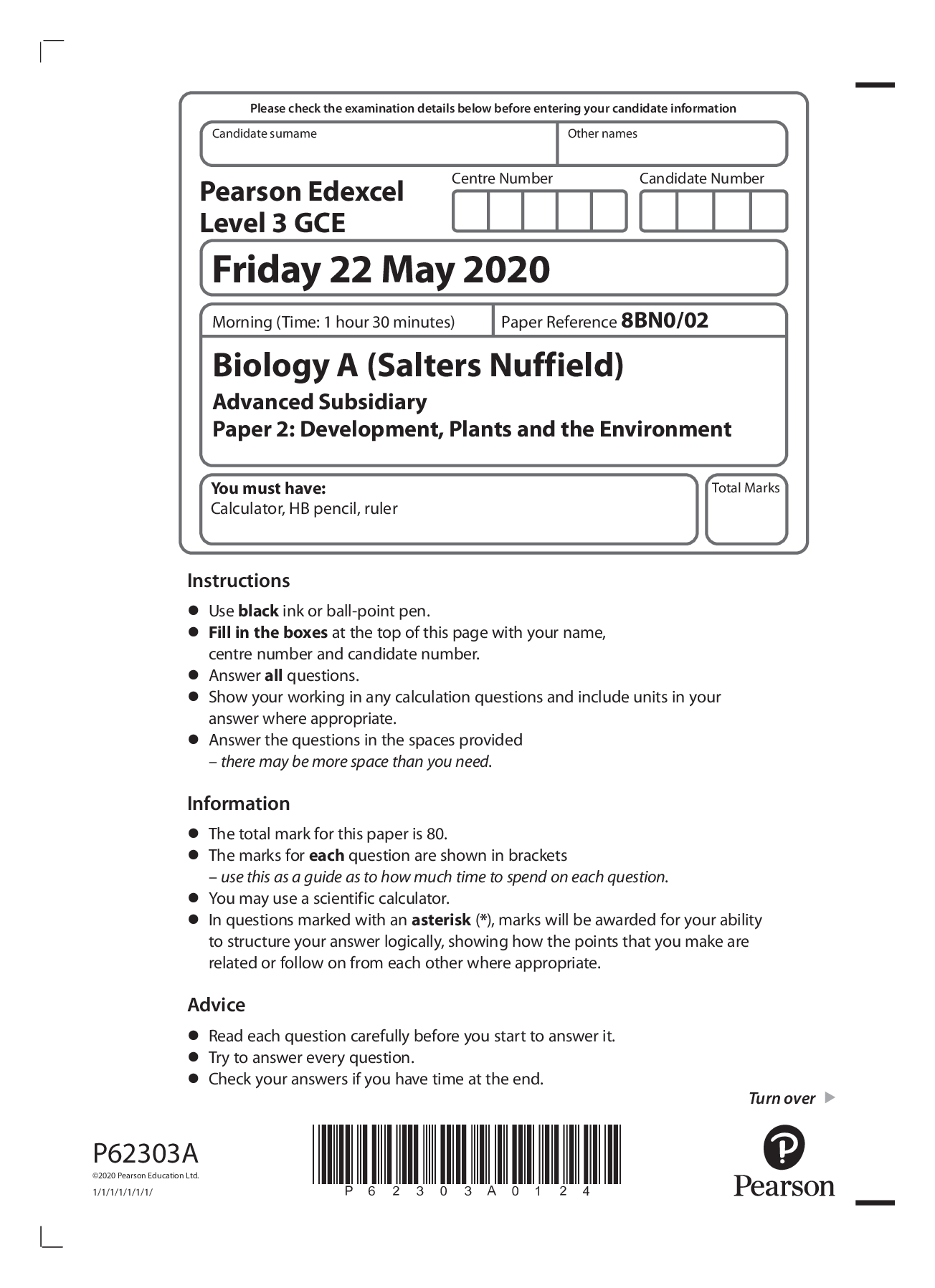 Biology > Edexcel Question Paper > Pearson Edexcel Level 3 GCE Biology A (Salters Nuffield) Advanced Subsidiary Paper 2: Development, Plants and the Environment May 2020 QUESTION PAPER