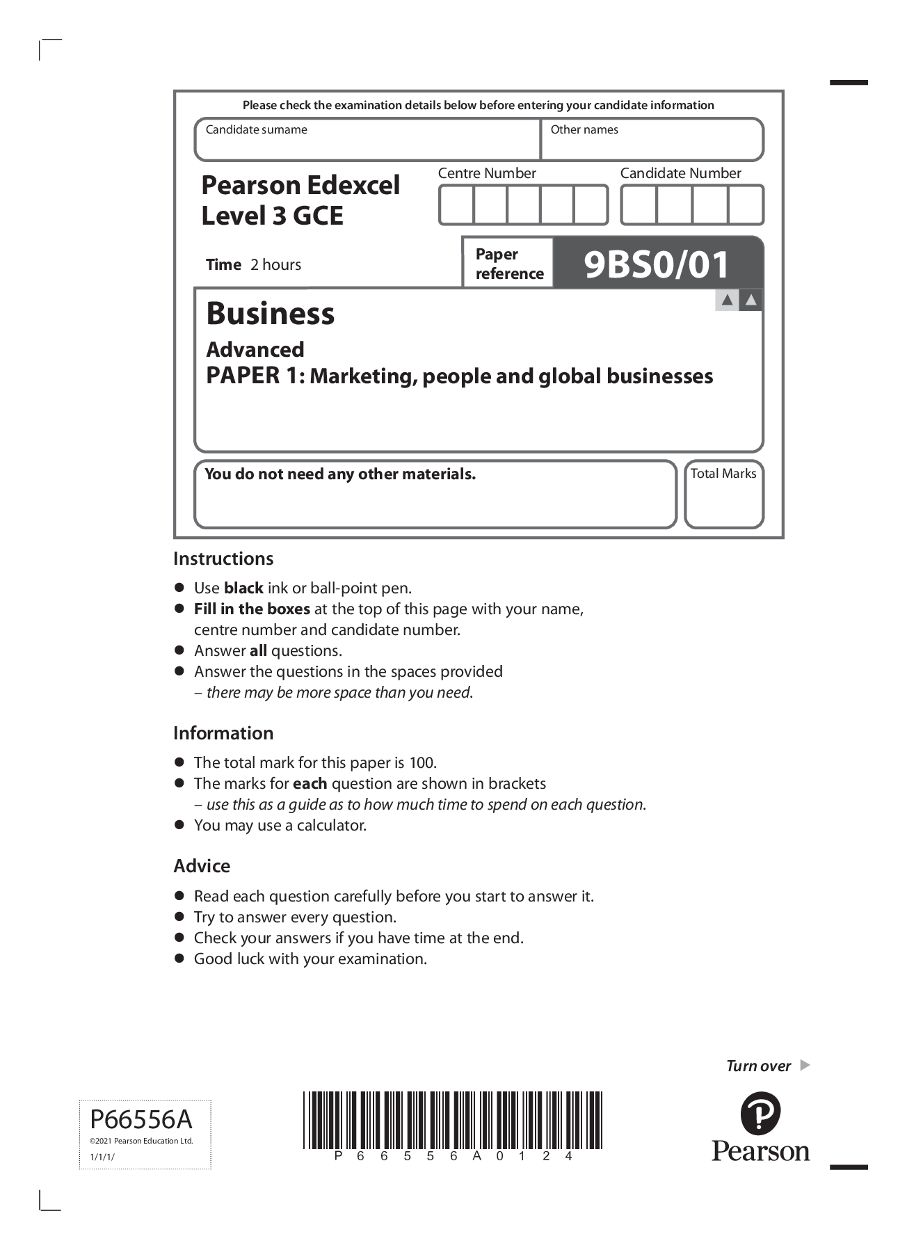 Business > Edexcel Question Paper > Pearson Edexcel GCE_Business_9BS0/01_Question Paper_2021 | Paper 1: Marketing, people and global businesses