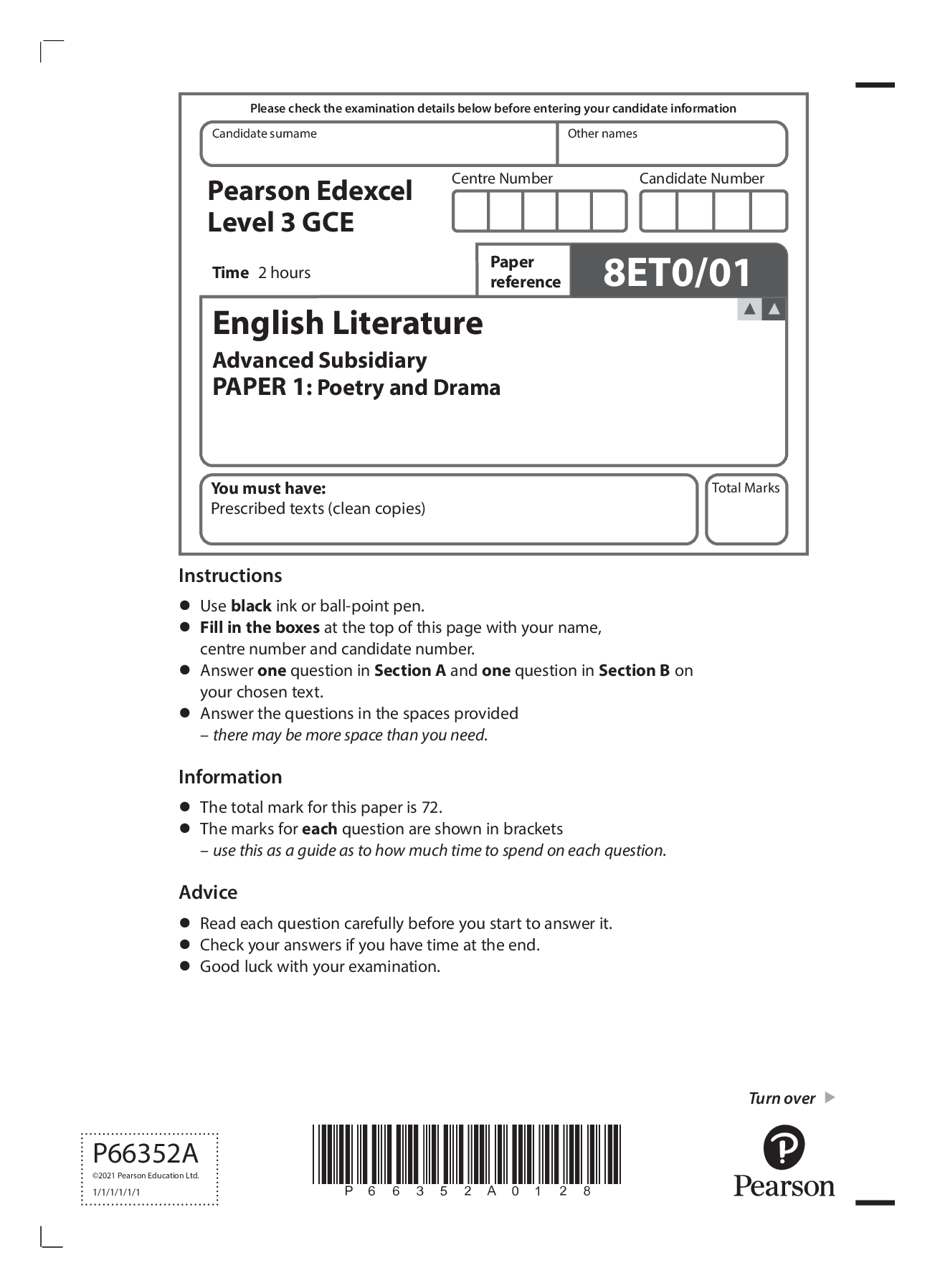 English Literature > Edexcel Question Paper > Pearson Edexcel Level 3 GCE English Literature Advanced Subsidiary PAPER 1: Poetry and Drama 8ET0/01