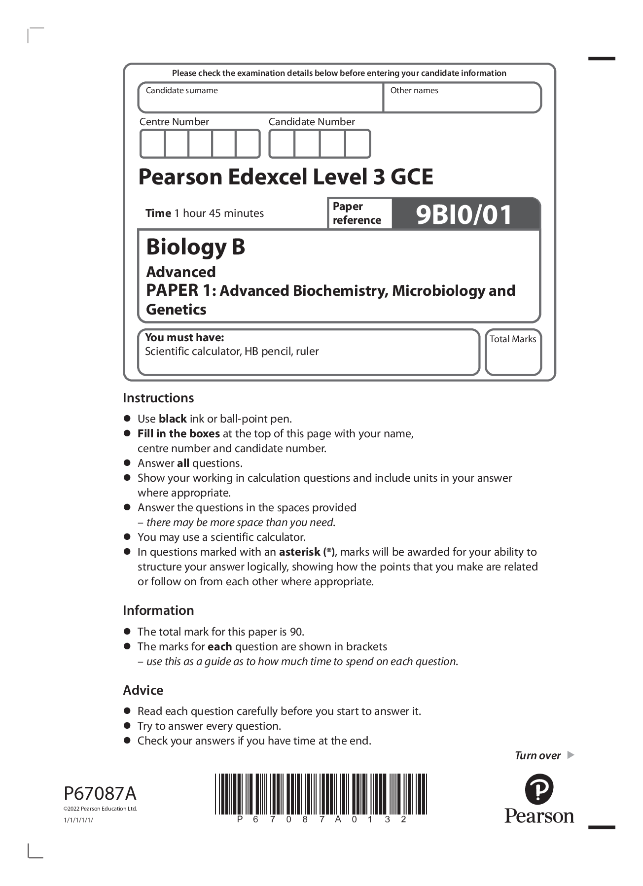 Biology > Edexcel Question Paper > Pearson Edexcel Level 3 GCE Biology B Advanced PAPER 1: Advanced Biochemistry, Microbiology and Genetics 9BI0/01