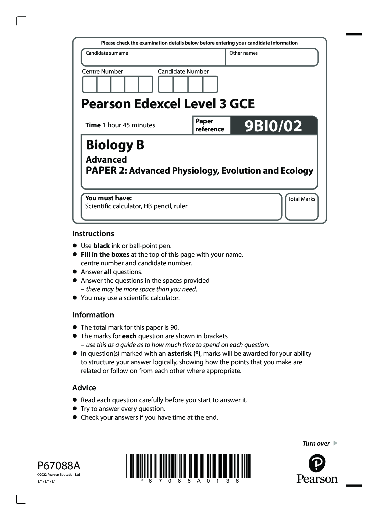 Biology > Edexcel Question Paper > Pearson Edexcel Level 3 GCE Biology B Advanced PAPER 2: Advanced Physiology, Evolution and Ecology 9BI0/02