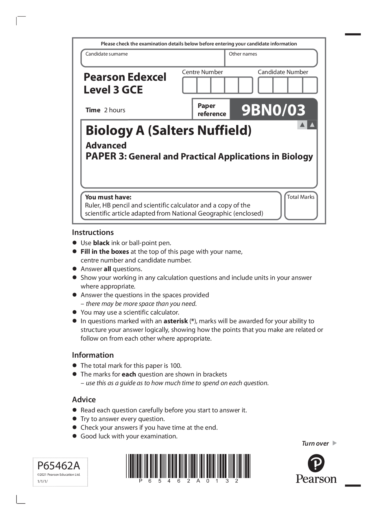 Biology > Edexcel Question Paper > Pearson Edexcel Level 3 GCE Biology A (Salters Nuffield) Advanced QUESTION PAPER 3: General and Practical Applications in Biology 2021