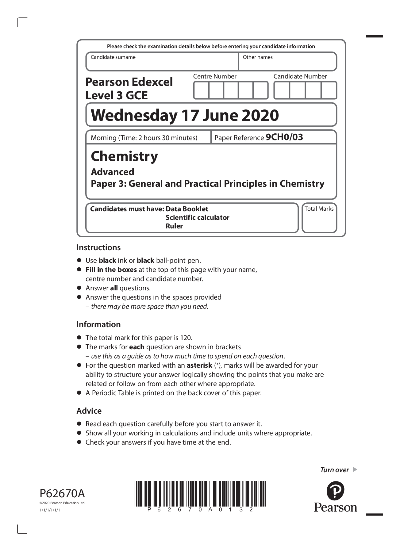 Chemistry > Edexcel Question Paper > Pearson Edexcel GCE_Chemistry_9CH0/03_Question Paper_June 2020 | Paper 3: General and Practical Principles in Chemistry