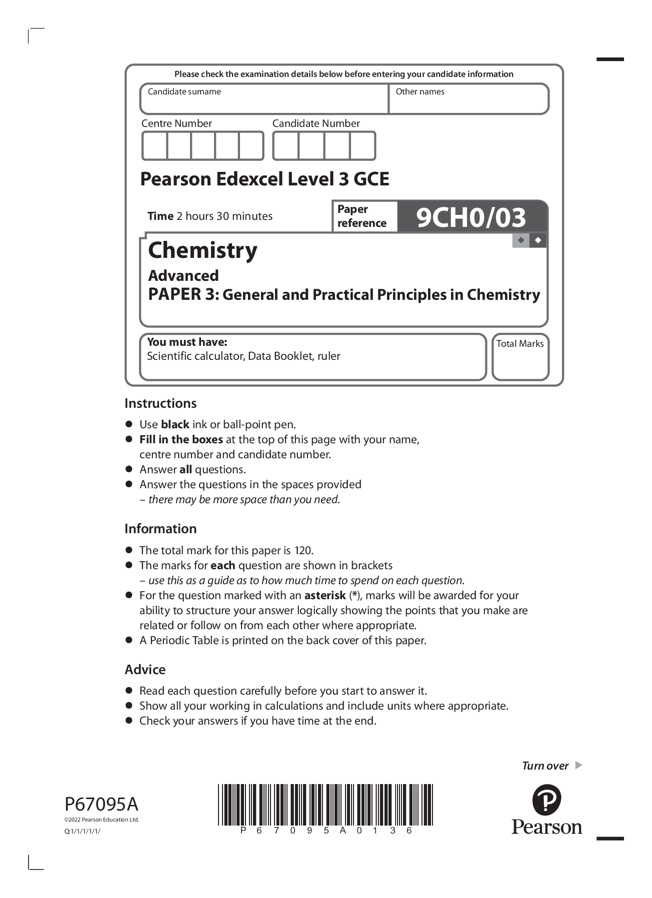 Chemistry > Edexcel Question Paper > Pearson Edexcel Level 3 GCE Chemistry Advanced PAPER 3: General and Practical Principles in Chemistry 9CH0/03