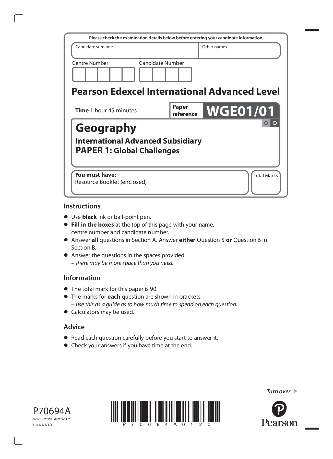 Geography > Edexcel Question Paper > Pearson Edexcel International Advanced Level Geography International Advanced Subsidiary PAPER 1: Global Challenges QUESTION PAPER 2022