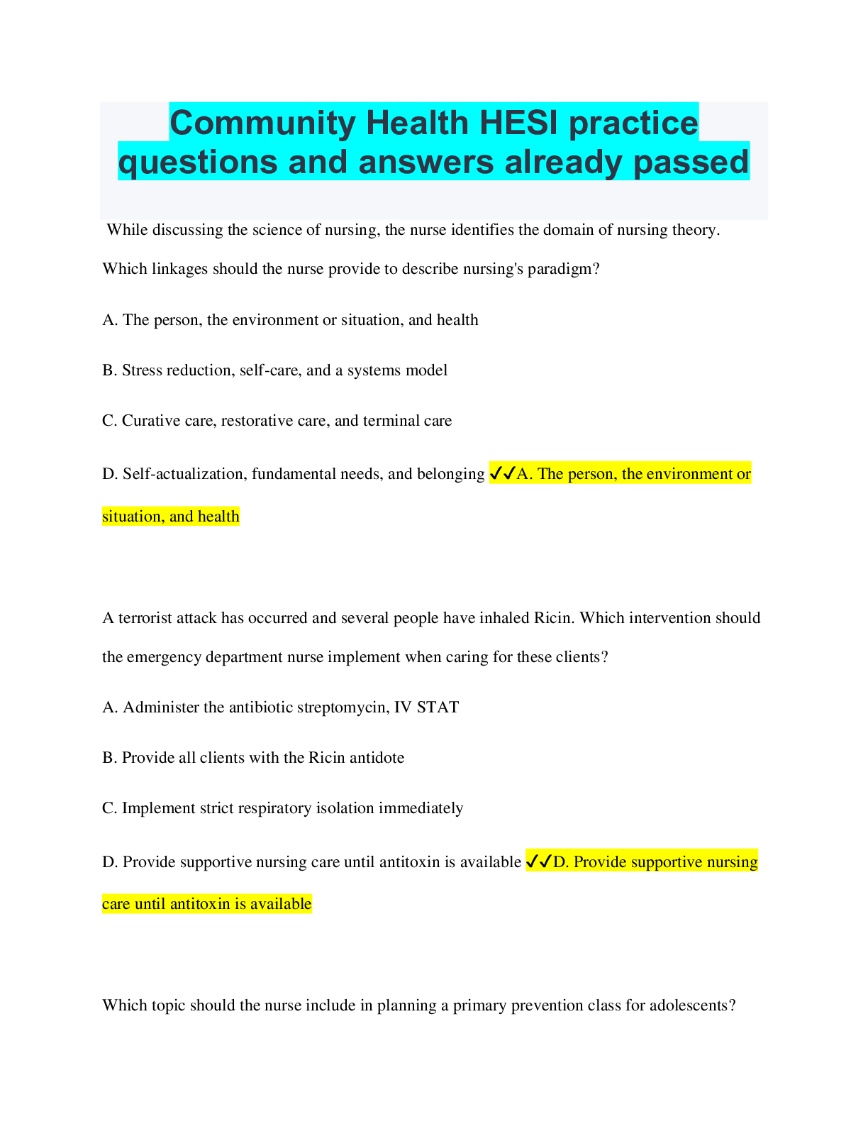 Health Care > QUESTION PAPER & MARK SCHEME > HESI Community Health Practice Questions and Answers Graded A
