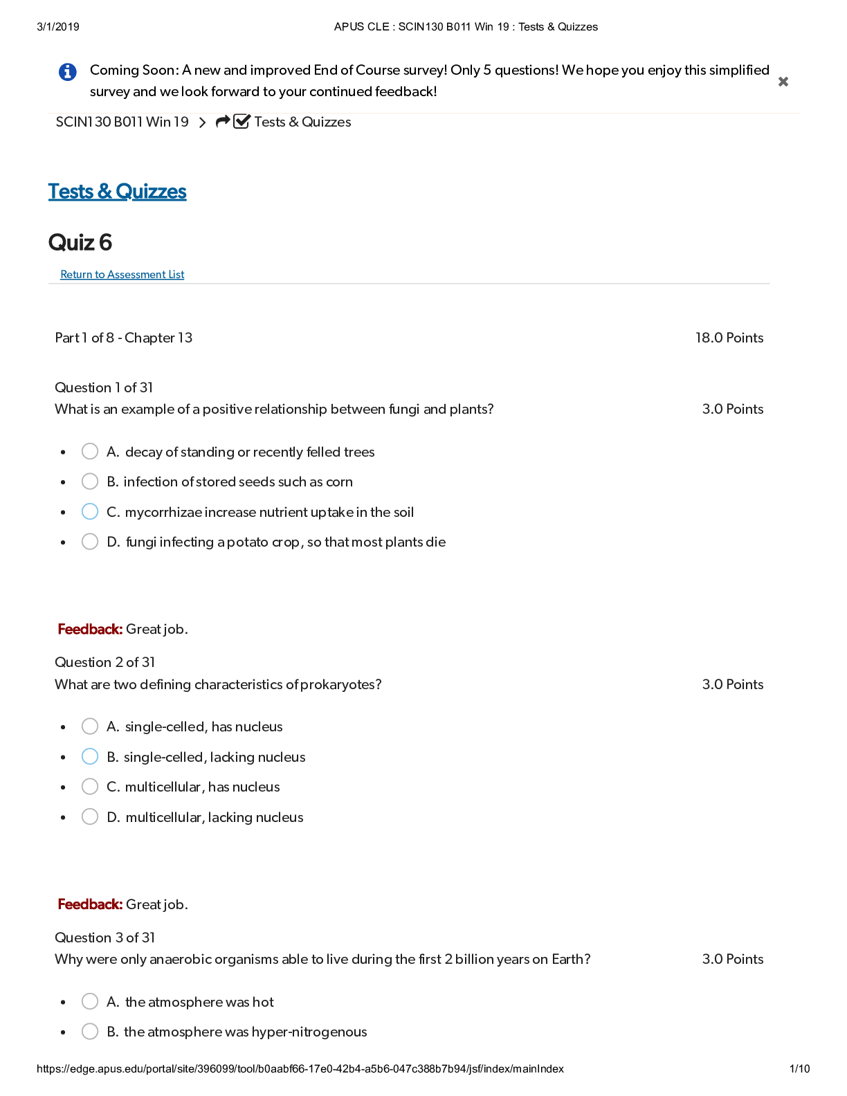 Biology > Quiz > American Public UniversitySCIN 131C00 Science Quiz 6./ APUS CLE : SCIN130 B011 Win 19 : Tests & Quizzes