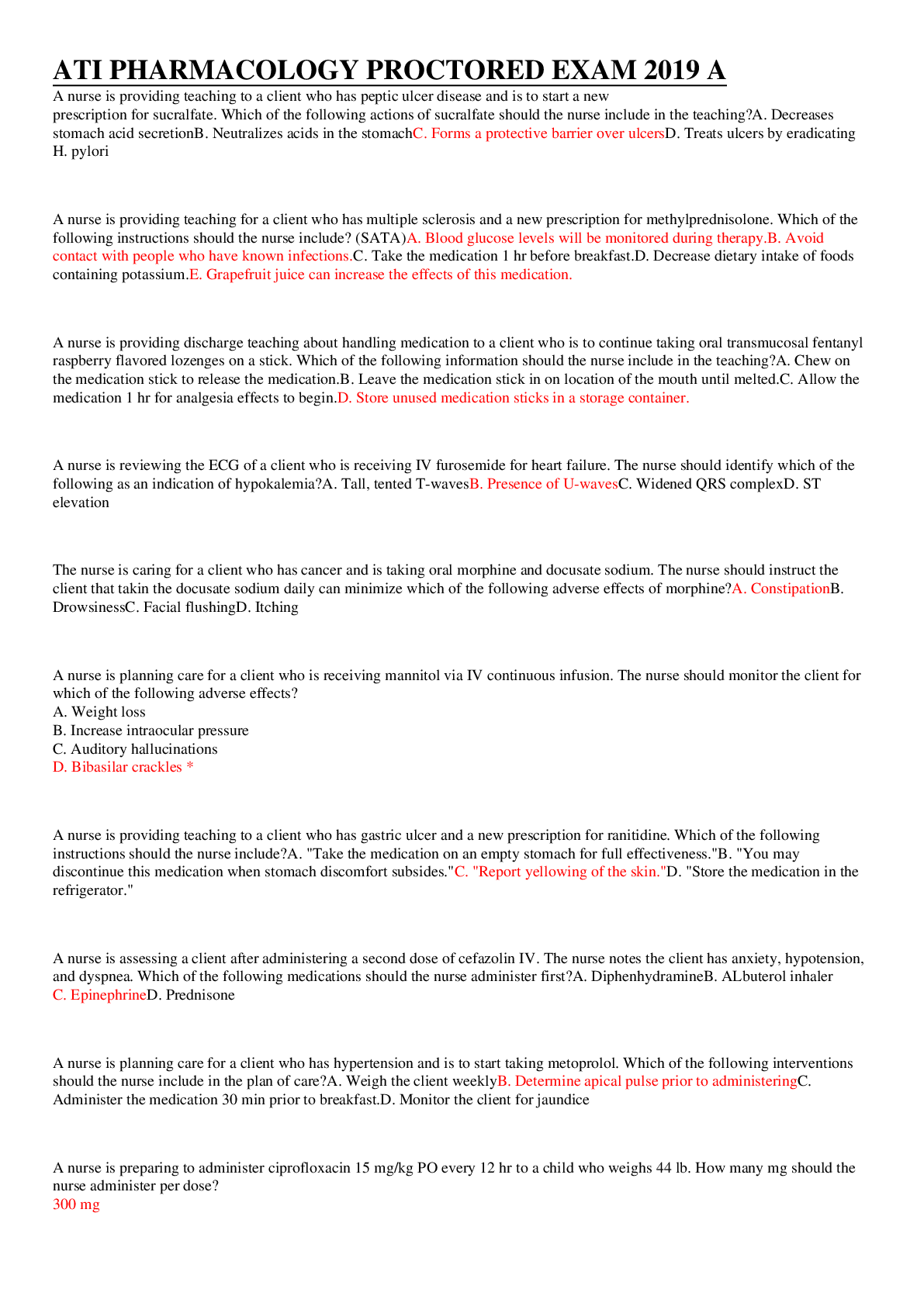 Health Care > Quiz > ATI PHARMACOLOGY PROCTORED EXAM 2019 A - STUDY GUIDE