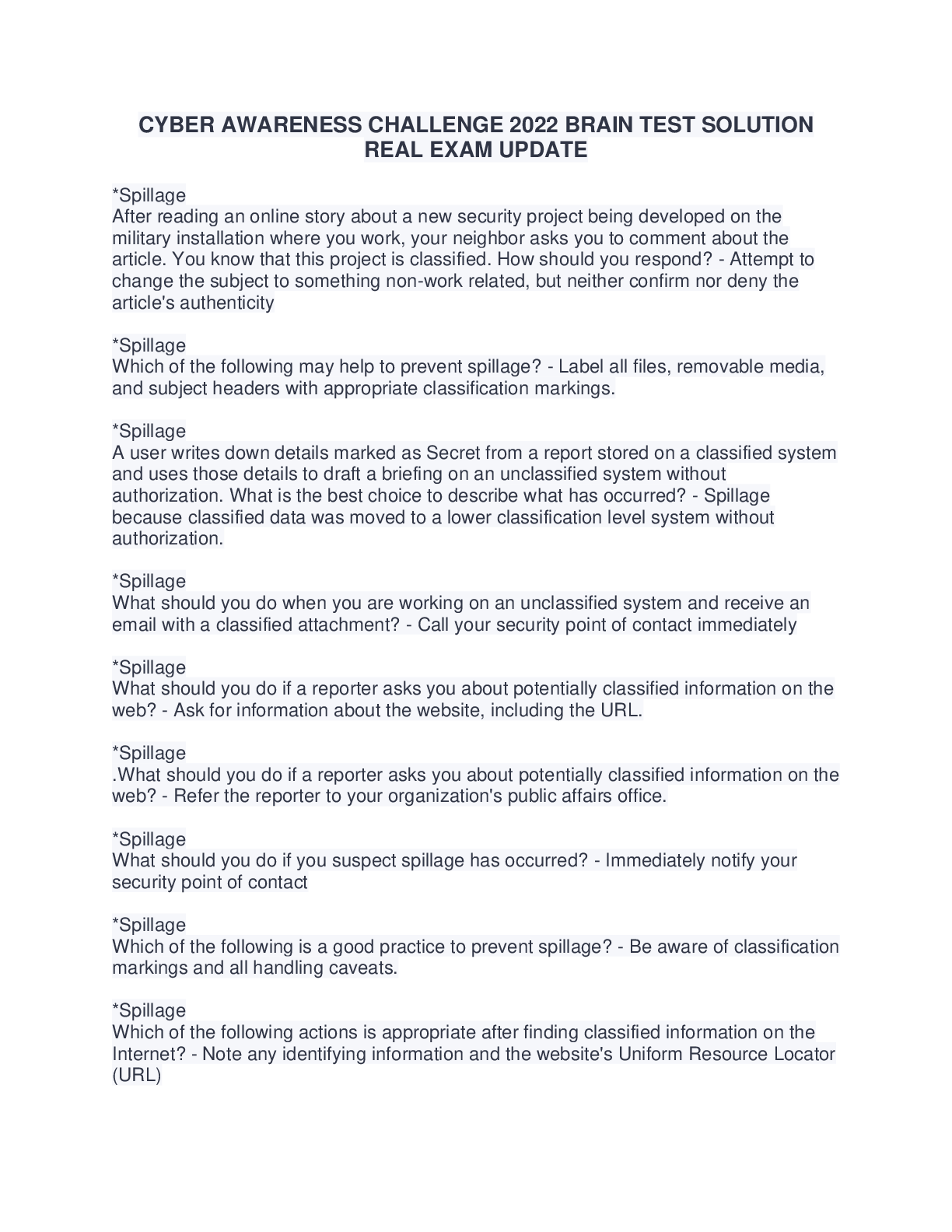 Biology > Quiz > CYBER AWARENESS CHALLENGE 2022 BRAIN TEST SOLUTION REAL EXAM UPDATE
