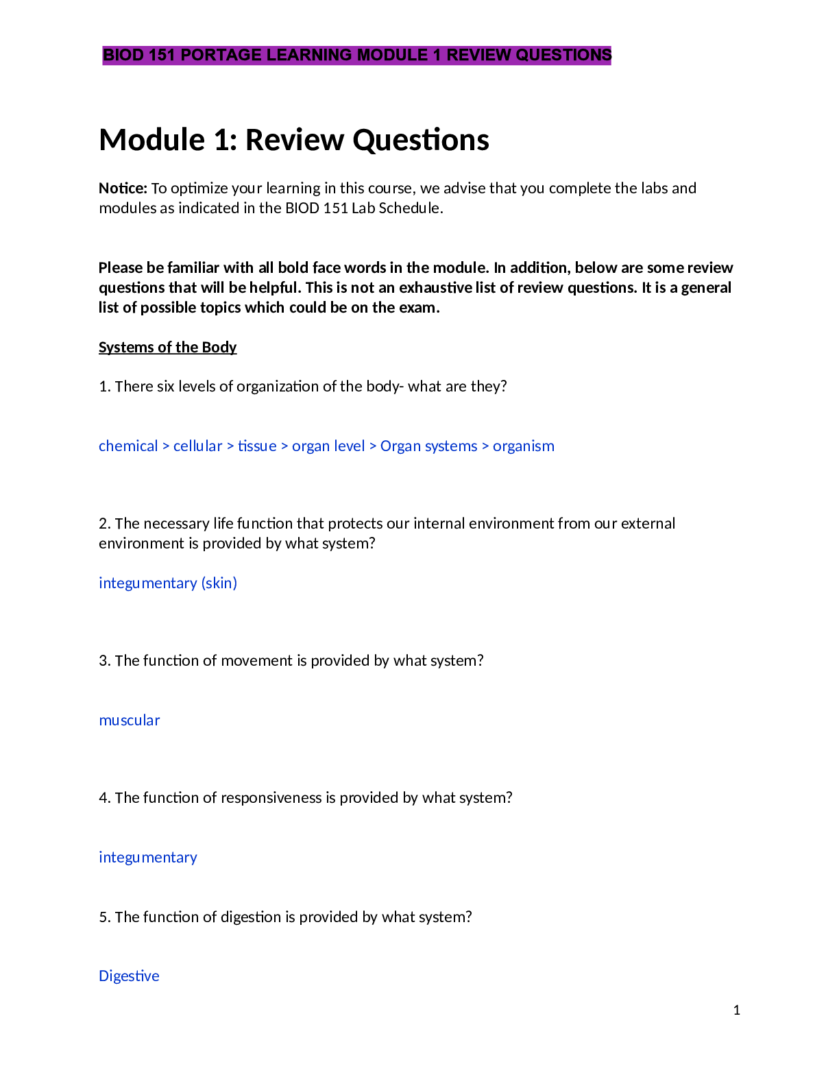 Biology > Quiz > BIOD 151 PORTAGE LEARNING MODULE 1 REVIEW QUESTIONS