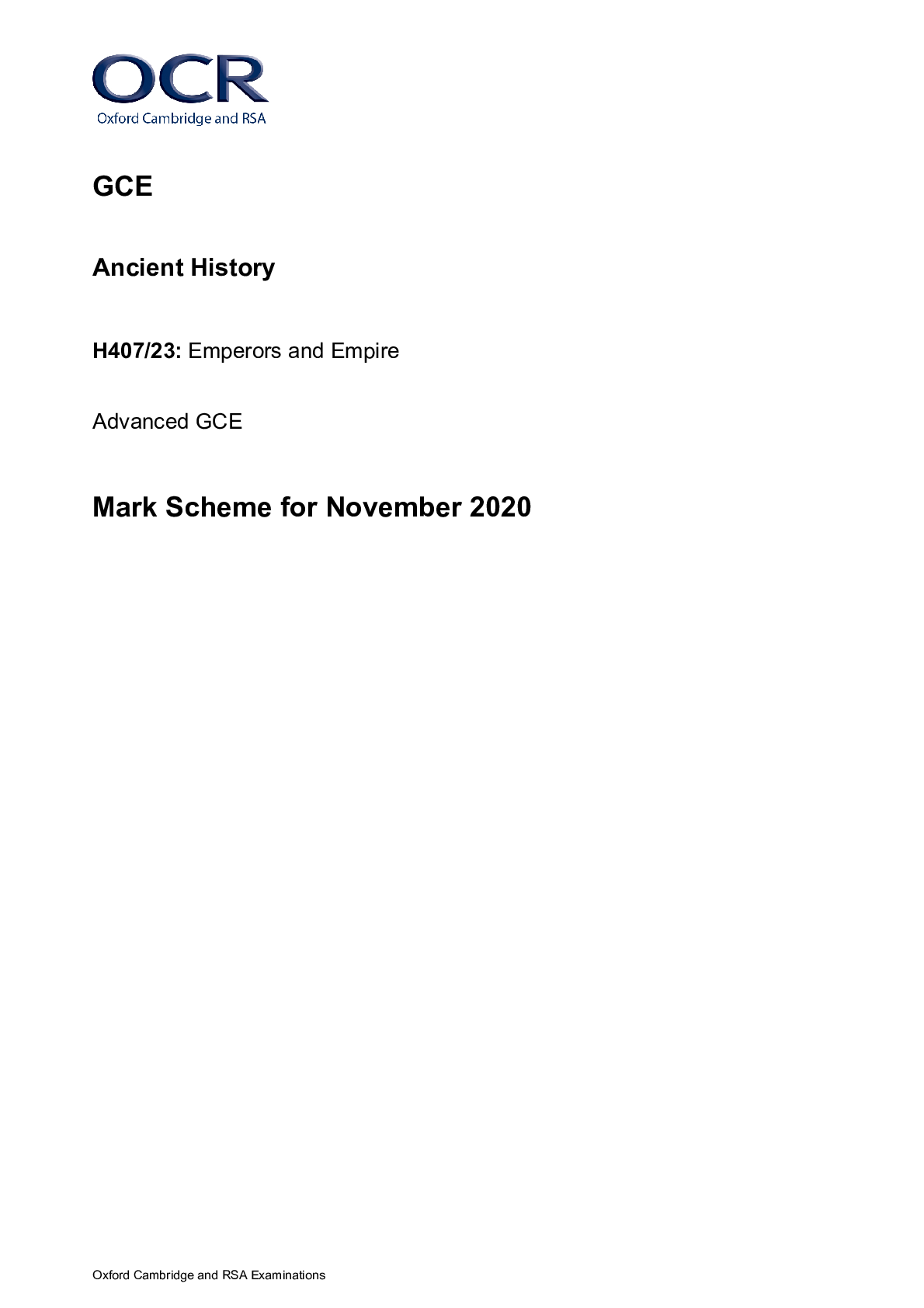 History > As Level Question Papers > > A Level (GCE) Ancient History H407/23: Emperors and Empire Advanced GCE Mark Scheme for November 2020