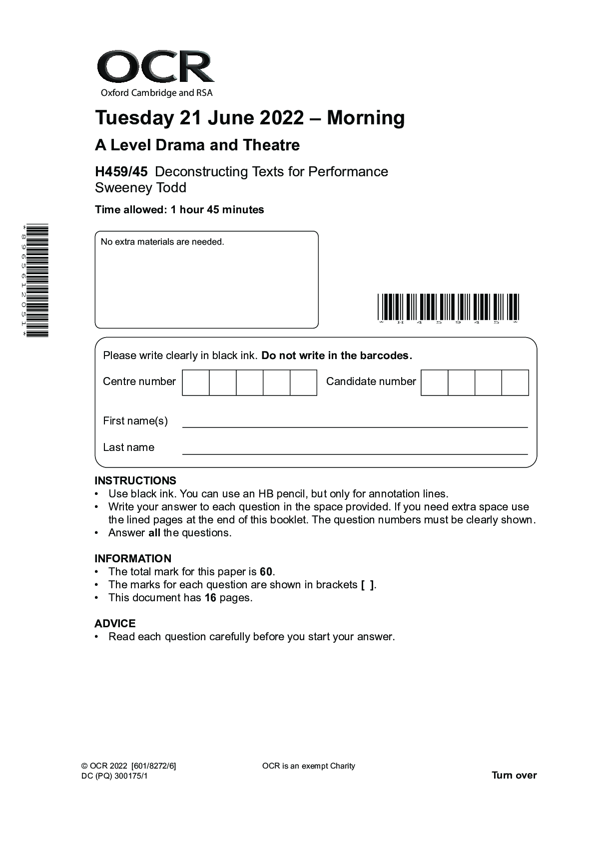 Drama and Theatre > As Level Question Papers > OCR A Level Drama and Theatre H459/45 Deconstructing Texts for Performance Sweeney Todd QUESTION PAPER Tuesday 21 June 2022 – Morning