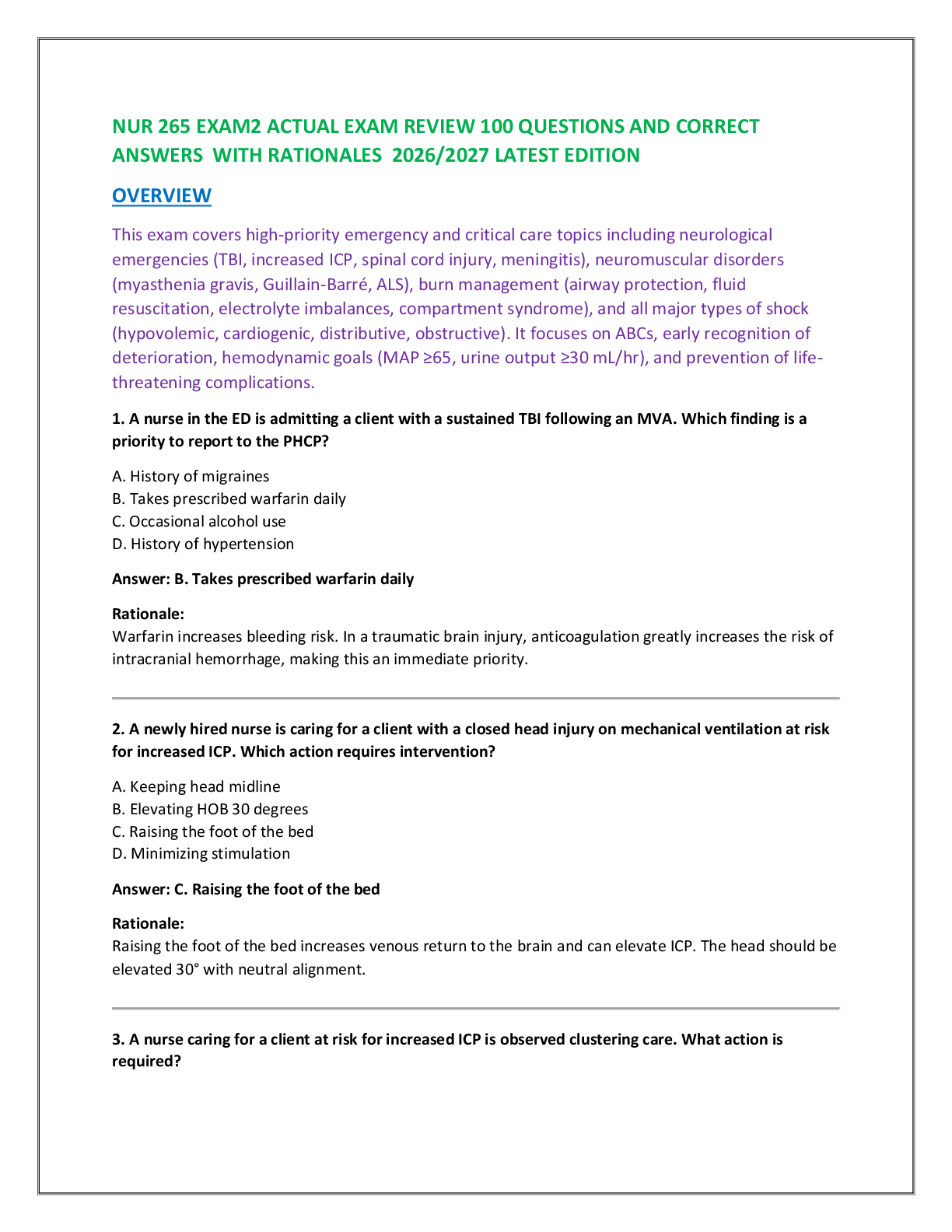 *NURSING > EXAM REVIEW > NUR 265 EXAM2 ACTUAL EXAM REVIEW 100 QUESTIONS AND CORRECT ANSWERS WITH RATIONALES 2026/2027 LATEST EDITION