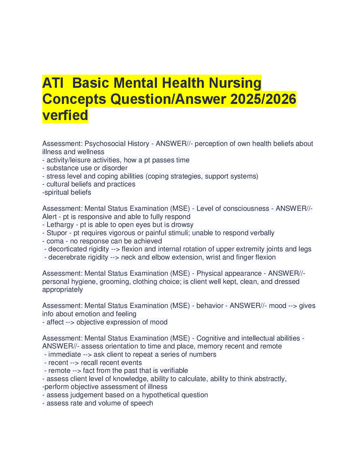 ATI Proctored Exam Maternal Newborn > A-Level Question Paper > ATI Basic Mental Health Nursing Concepts | Questions & Answers 2025/2026 Verified
