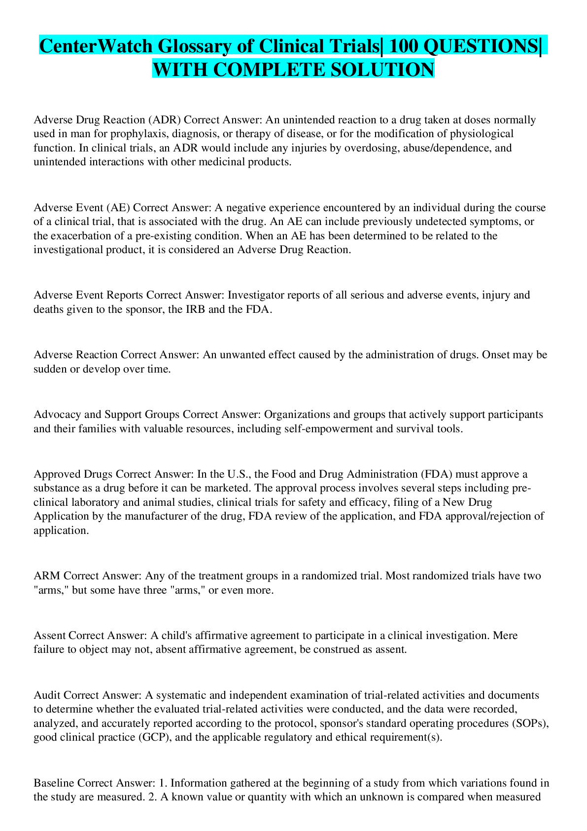 Health Care > EXAM > CenterWatch Glossary of Clinical Trials| 100 QUESTIONS| WITH COMPLETE SOLUTION