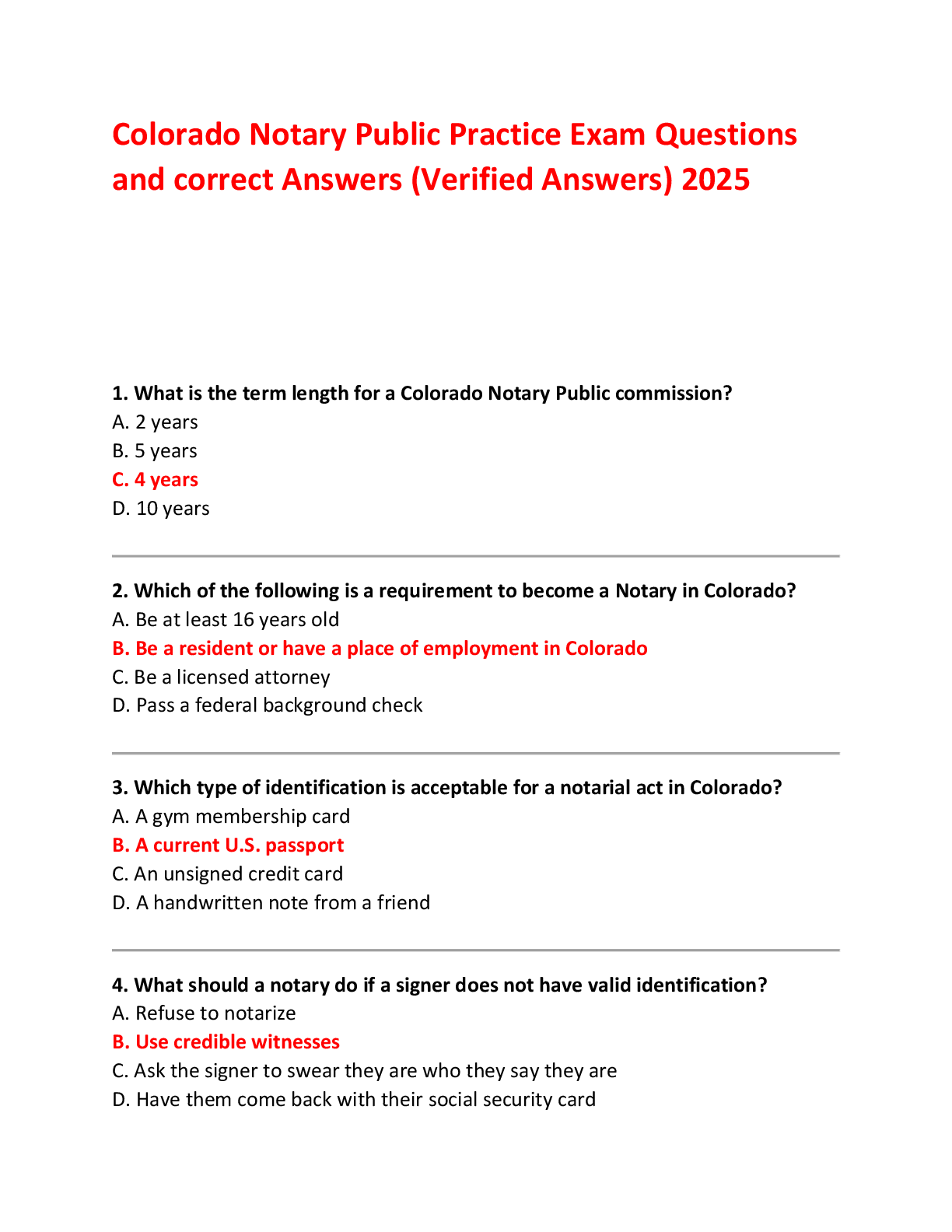 Insurance Studies > EXAM > Colorado Notary Public Practice Exam Questions and correct Answers (Verified Answers) 2025 1. What is the term length for a Colorado Notary Public commission?