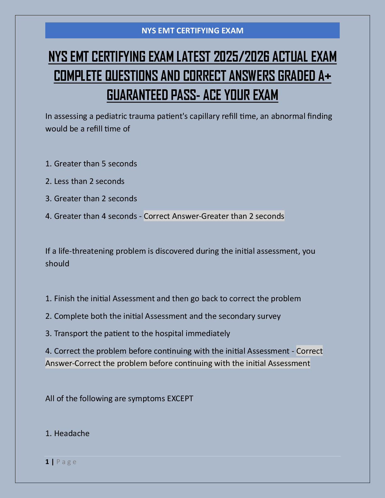 Emergency Medicine > EXAM > NYS EMT REVIEW STUDYGUIDE (3 IN ONE DOCUMENT) LATEST ACTUAL EXAM COMPLETE QUESTIONS AND CORRECT ANSWERS GRADED A+ GUARANTEED PASS- ACE YOUR EXAM