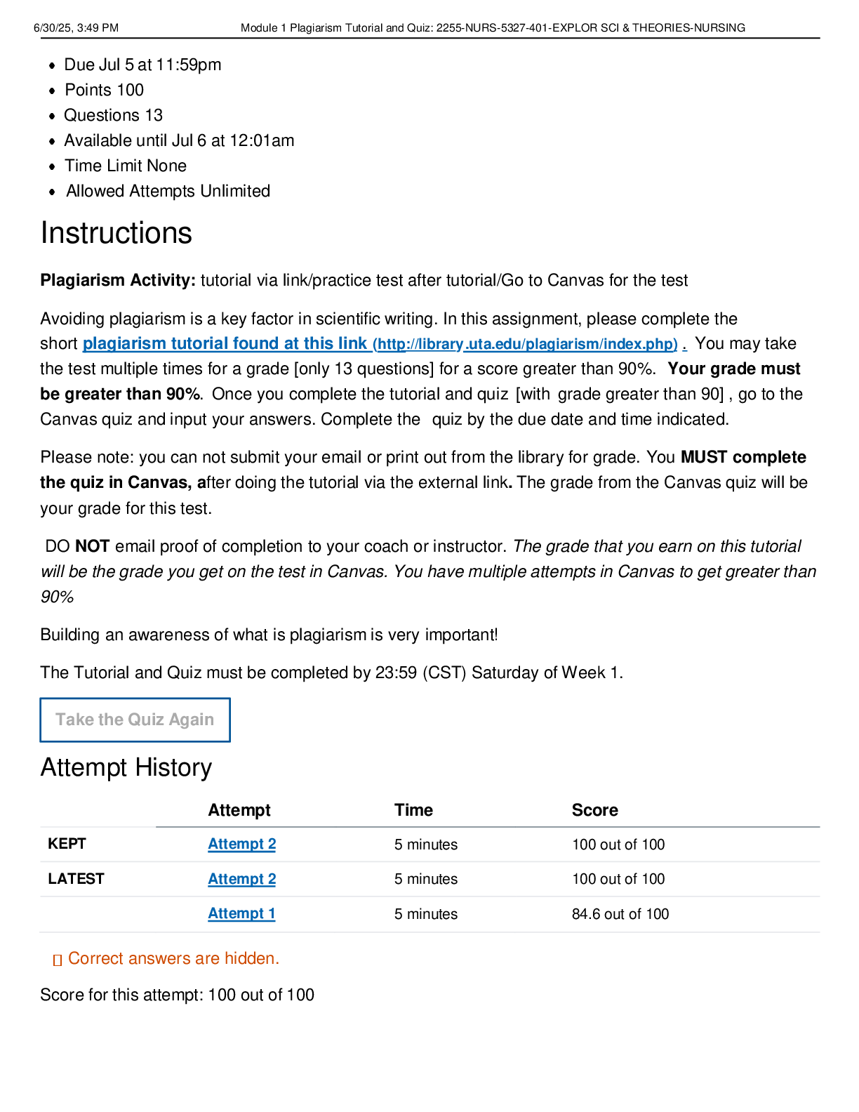 *NURSING > EXAM > NURS N 5327 Module 1 Plagiarism Tutorial and Quiz (Summer 2025) | Score 100% | UNIVERSITY OF TEXAS, ARLINGTON