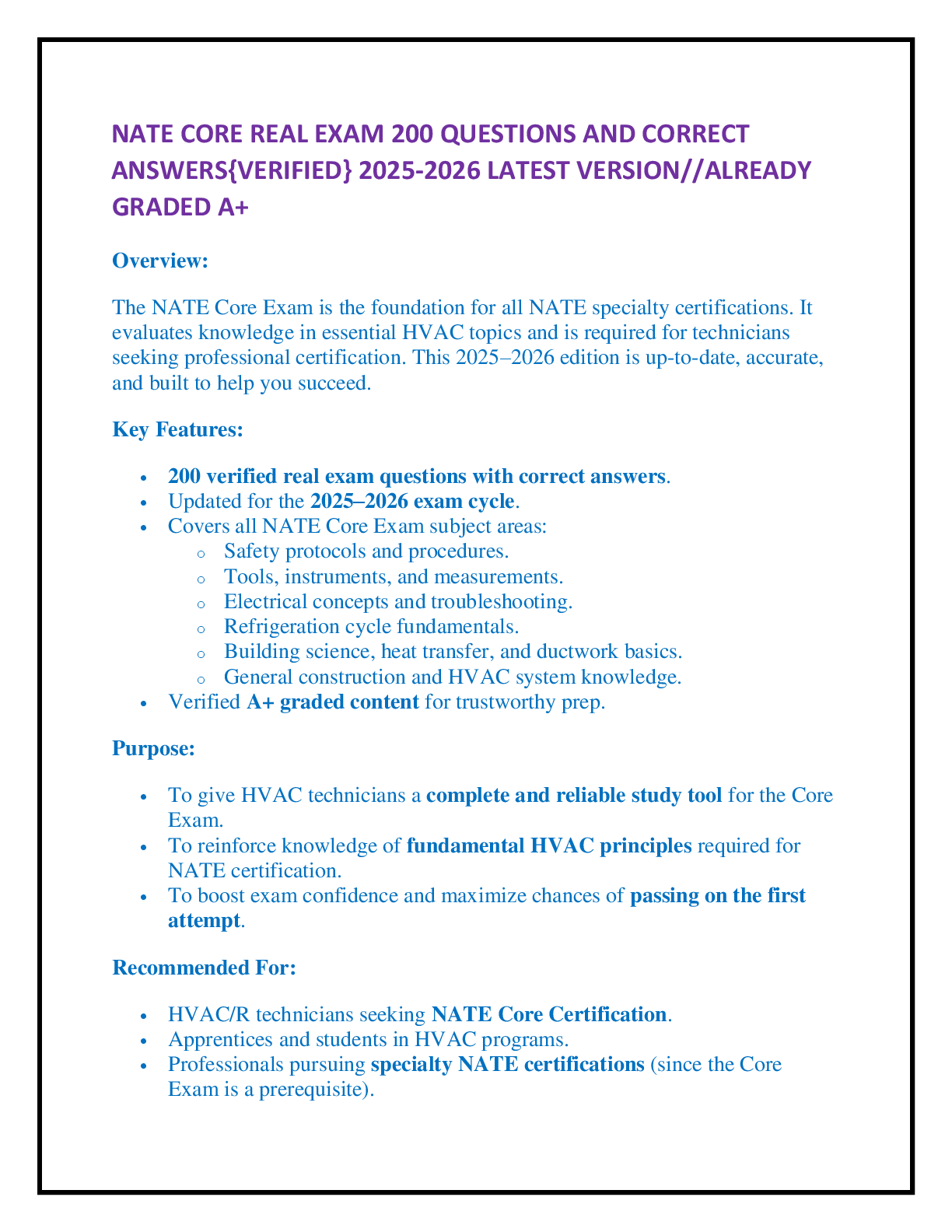 *NURSING > EXAM > NATE CORE REAL EXAM 200 QUESTIONS AND CORRECT ANSWERS{VERIFIED} 2025-2026 LATEST VERSION//ALREADY GRADED A+