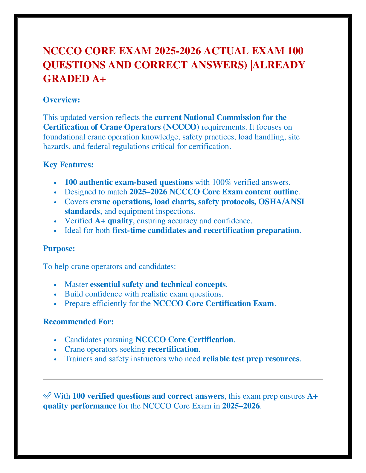 *NURSING > EXAM > NCCCO CORE EXAM 2025-2026 ACTUAL EXAM 100 QUESTIONS AND CORRECT ANSWERS) |ALREADY GRADED A+