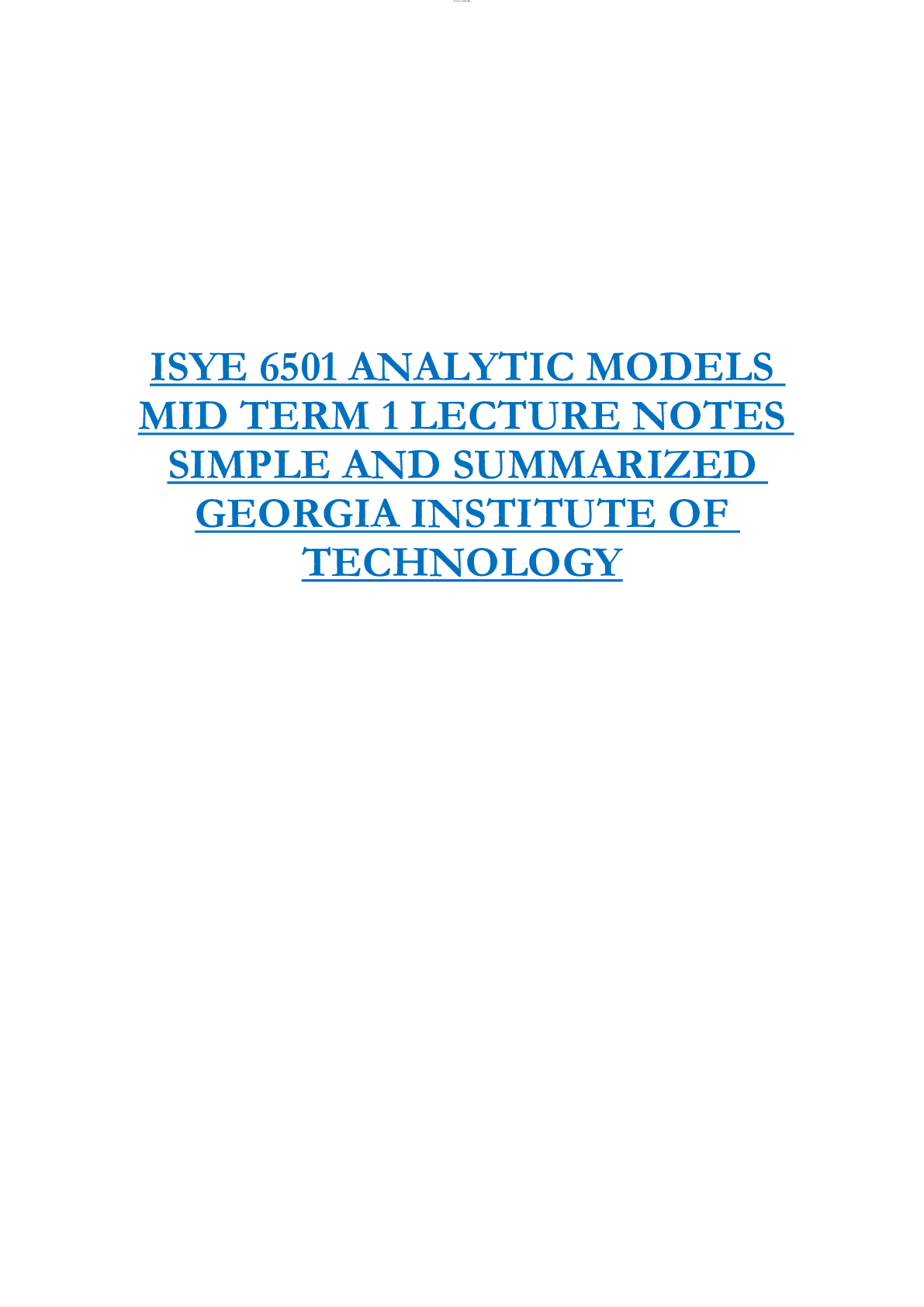 *NURSING > EXAM > ISYE 6501 ANALYTIC MODELS MID TERM 1 LECTURE NOTES SIMPLE AND SUMMARIZED GEORGIA INSTITUTE OF TECHNOLOGY