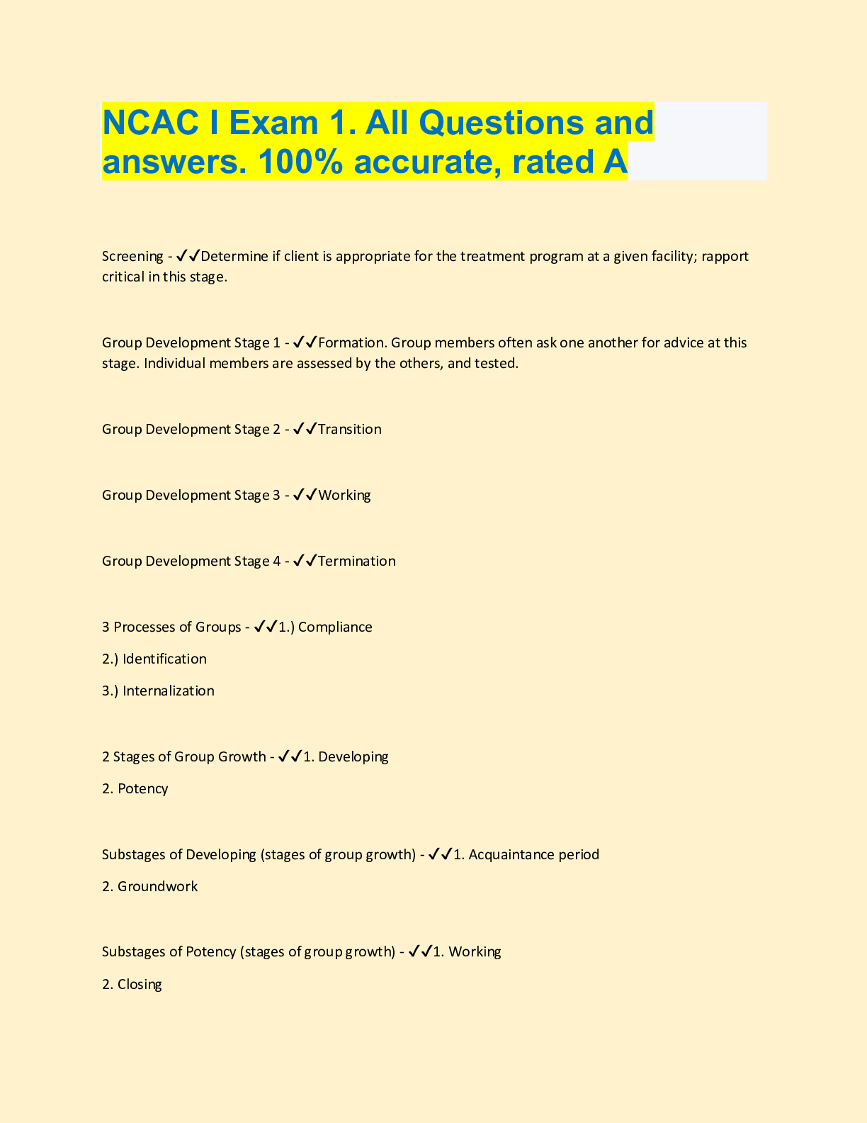 Social Sciences > QUESTIONS & ANSWERS > NCAC I Exam Questions and answers, 100% Accurate. Graded A+ Screening - ✔✔-Determine if client is a