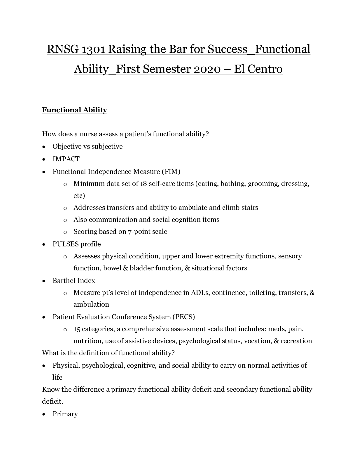 *NURSING > EXAM > RNSG 1301 Raising the Bar for Success_Functional Ability_First Semester 2020 – El Centro | RNSG1301 Raising the Bar for Success _ Functional Ability 2020