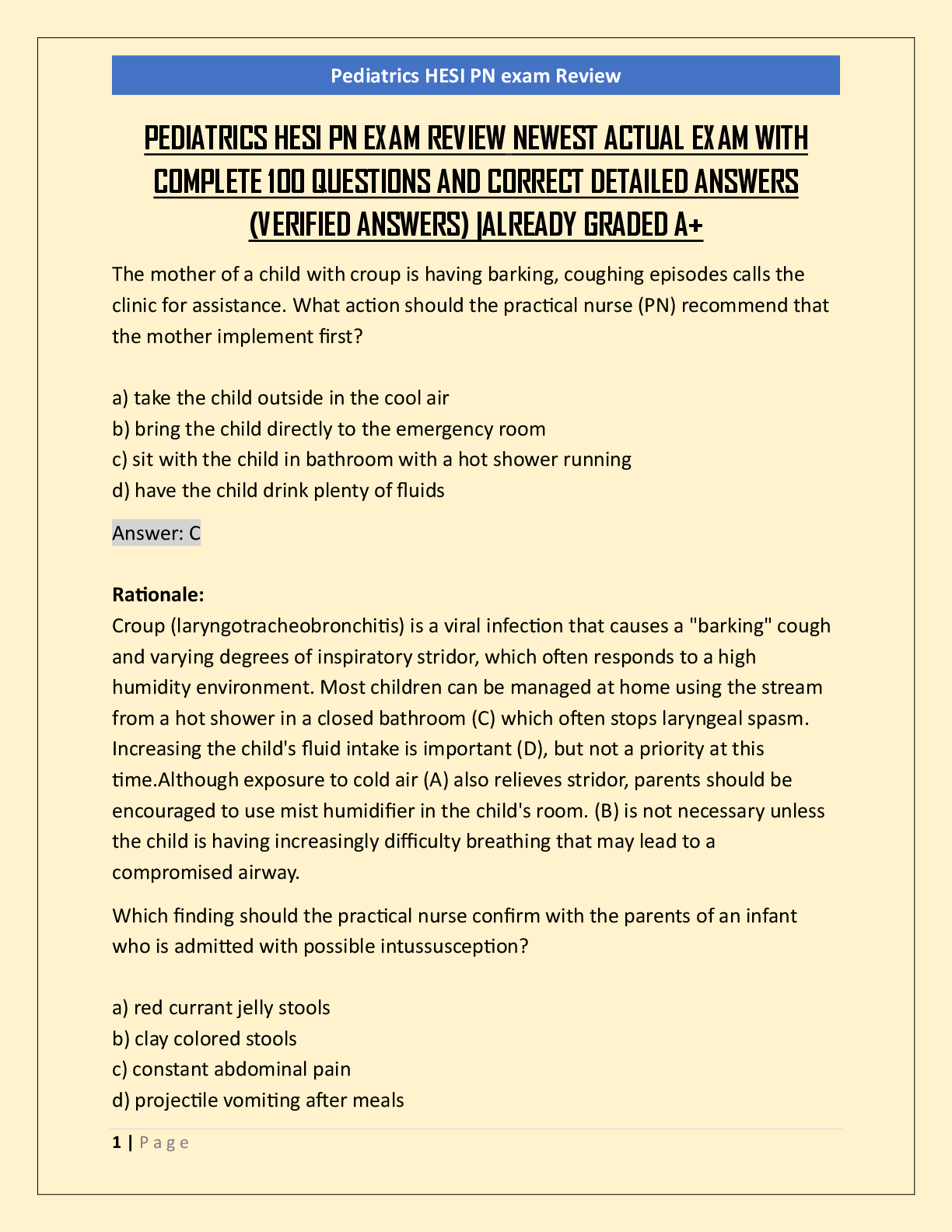 *NURSING > EXAM REVIEW > PEDIATRICS HESI PN EXAM REVIEW NEWEST ACTUAL EXAM WITH COMPLETE 100 QUESTIONS AND CORRECT DETAILED ANSWERS (VERIFIED ANSWERS) |ALREADY GRADED A+