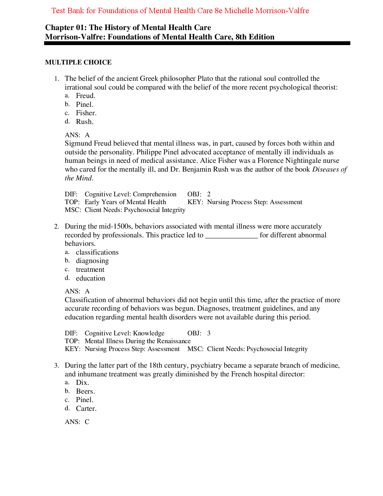 *NURSING > TEST BANKS > Test Bank Foundations of Mental Health Care 8th Edition By Michelle Morrison-Valfre